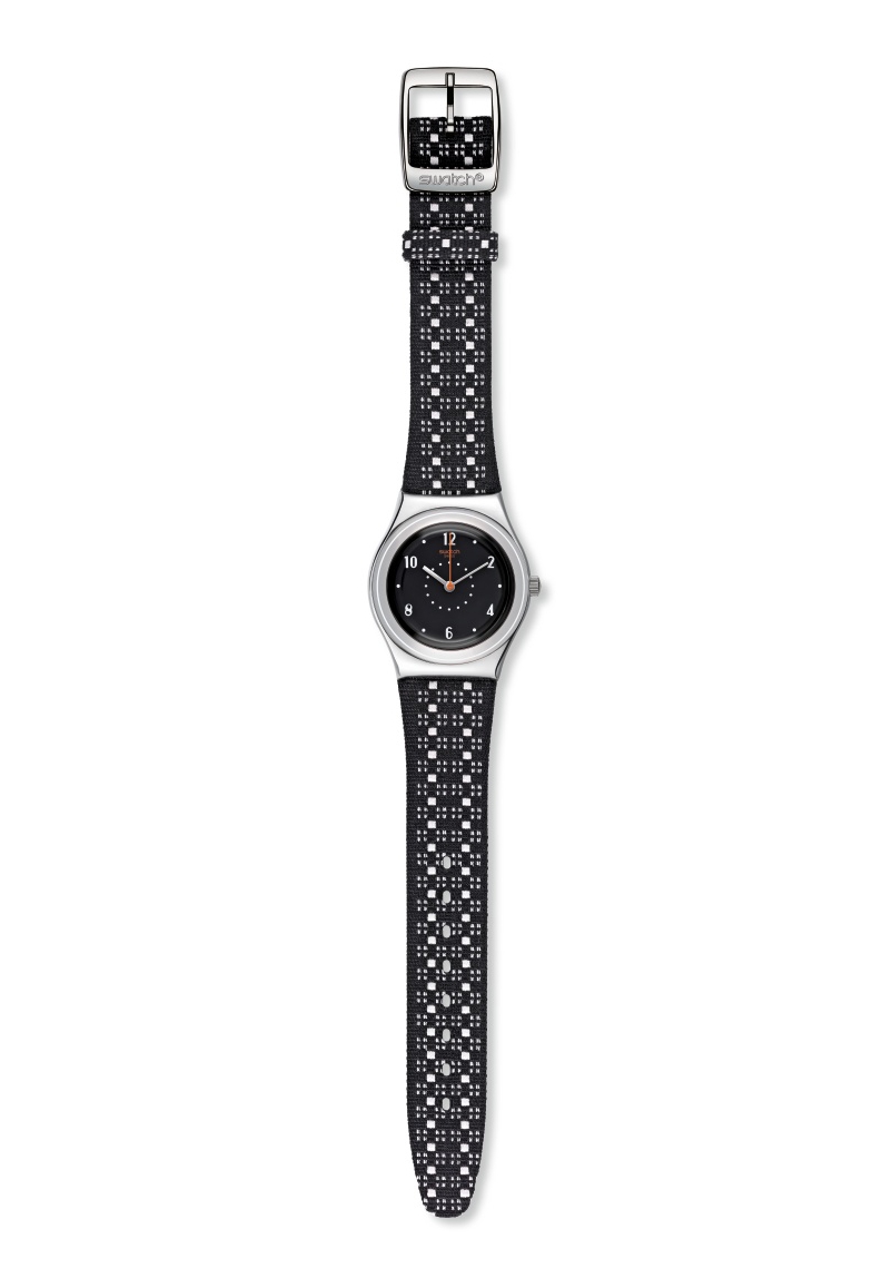Auf dem schwarzen Zifferblatt befindet sich ein Swatch Logo.