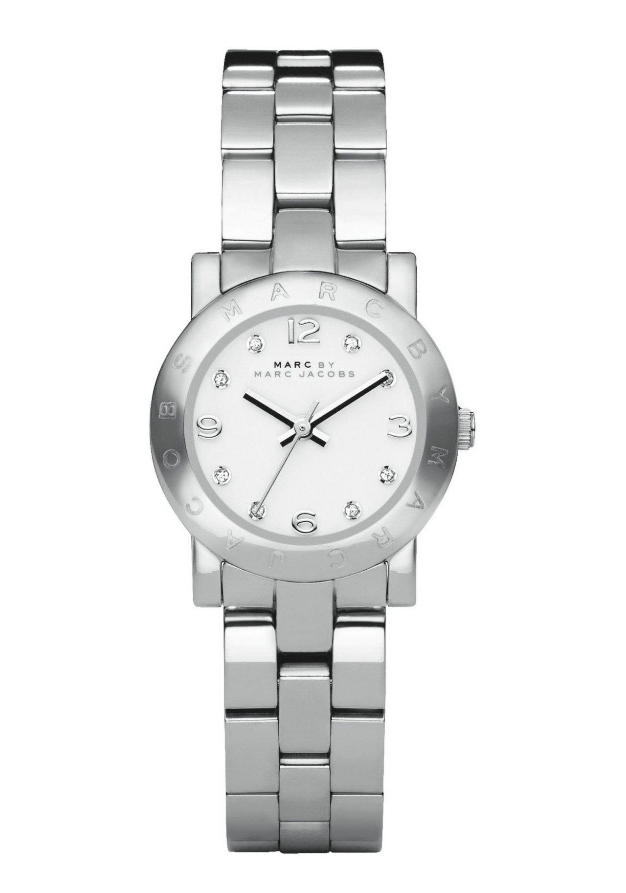 Auf dem silberfarbenem Zifferblatt befindet sich ein Marc Jacobs Logo.