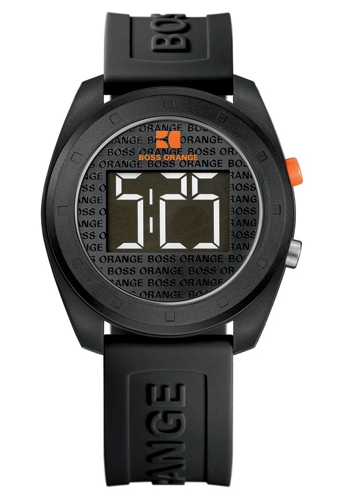 Schwarzes Zifferblatt mit Boss Orange-Logo oberhalb der Digitalanzeige