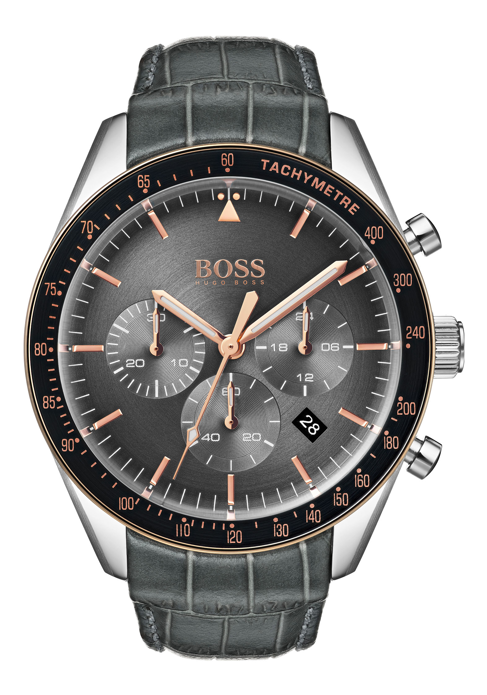 Auf dem grauen Zifferblatt befindet sich ein Boss Logo.