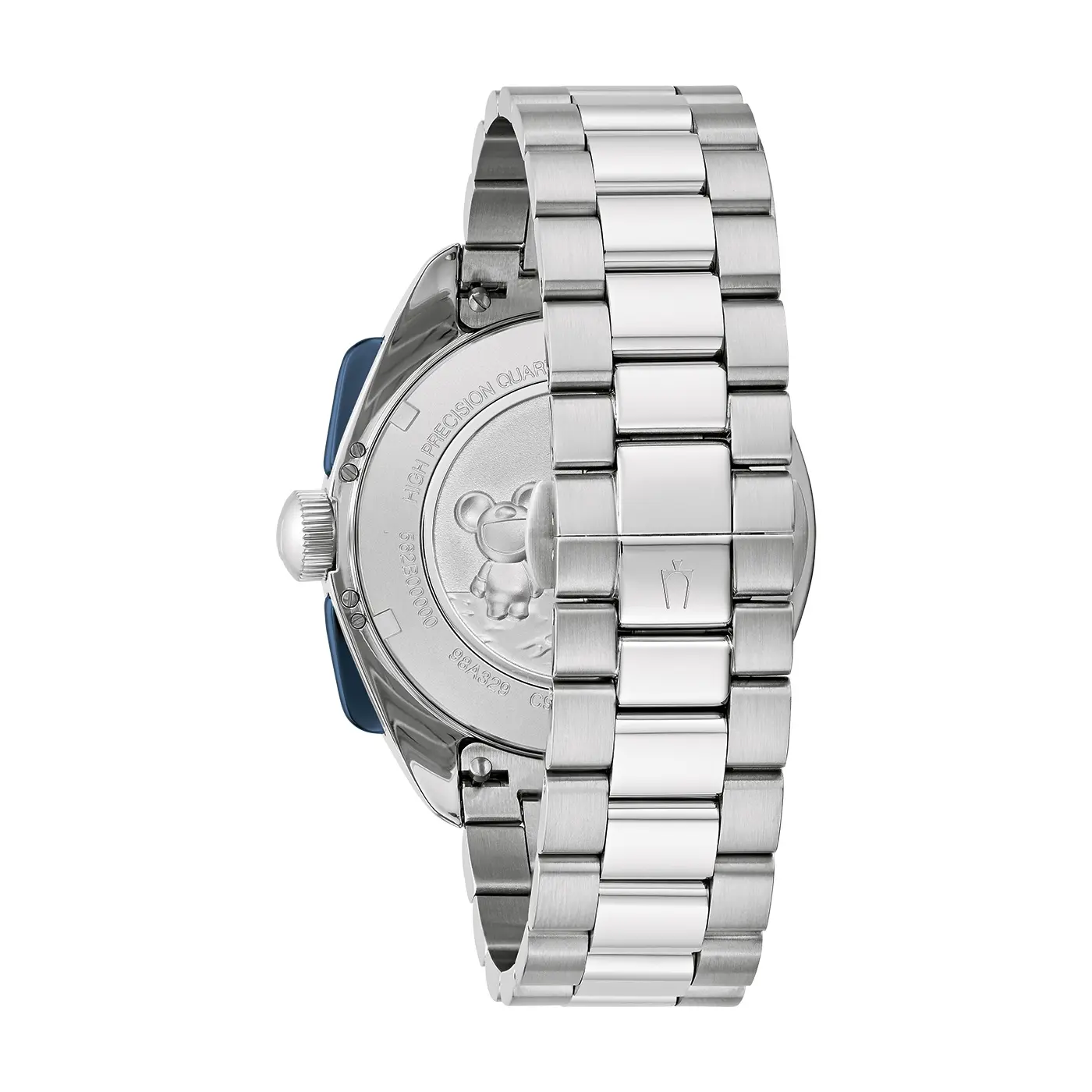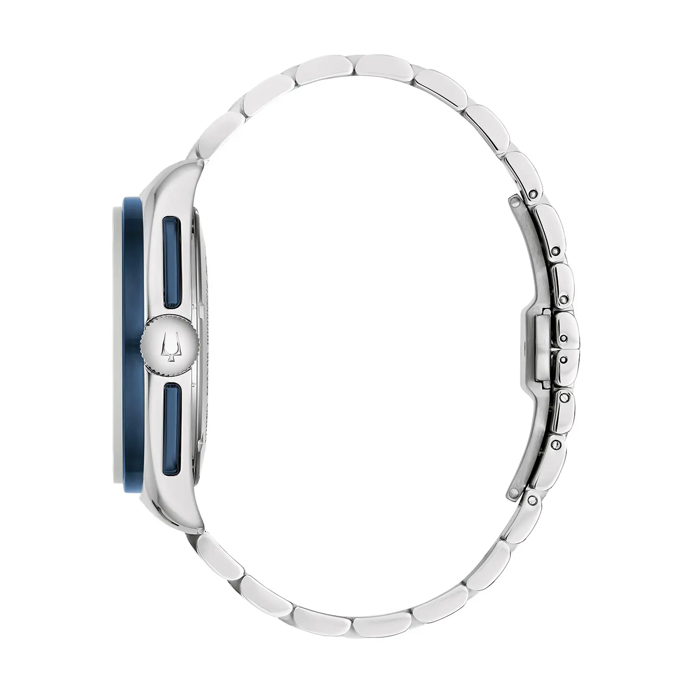 endrücker und die Krone mit der Bulova-Stimmgabel zieren das 43,5 mm große silberfarbene Edelstahlgehäuse, während die 1/20-Sekunden-Chronograph
