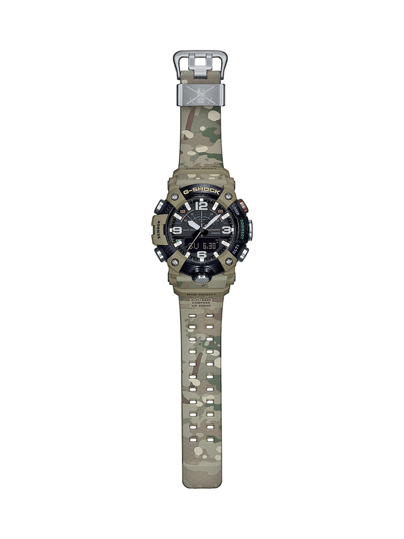 weiterhin dafür, dass die Uhr problemlos abzulesen ist. Auch besitzt die Uhr Sensoren für den Luftdruck und die Außentemperatur. Die Uhr lässt sich per Bluetooth problemlos mit dem Smartphone koppeln, sodass Features wie der Phone-Finder möglich werden. Dieser sendet einen Alarm an das Smartphone, sobald der Knopf auf der Uhr aktiviert wird. Auch werden, dank der Track-Log Funktion, Daten im Smartphone gespeichert. So können die zurückgelegte Strecke und Höhenmeter im nachhinein auf einer Karte angesehen werden. Fünf individuell einstellbare Tagesalarme erinnern an wiederkehrende Ereignisse im Alltag. Ein beigefarbenes Resinarmband im Camo-Muster sorgt für einen angenehmen Tragekomfort und kann, dank integrierter Dornschließe