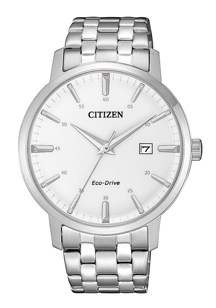 ist aus hochwertigem Edelstahl gefertigt. Auf der 3-Uhr-Position des weißen Zifferblattes befindet sich eine Datumsanzeige. Der äußere Rand ist mit einer vollständigen Minuterie versehen. Zudem verfügt das Modell über eine Energiereserveanzeige der Batterie, um jederzeit den Überblick über die Gangreserve