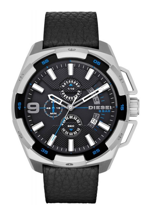 Auf dem schwarz strukturierten Zifferblatt befindet sich ein Diesel Logo.
