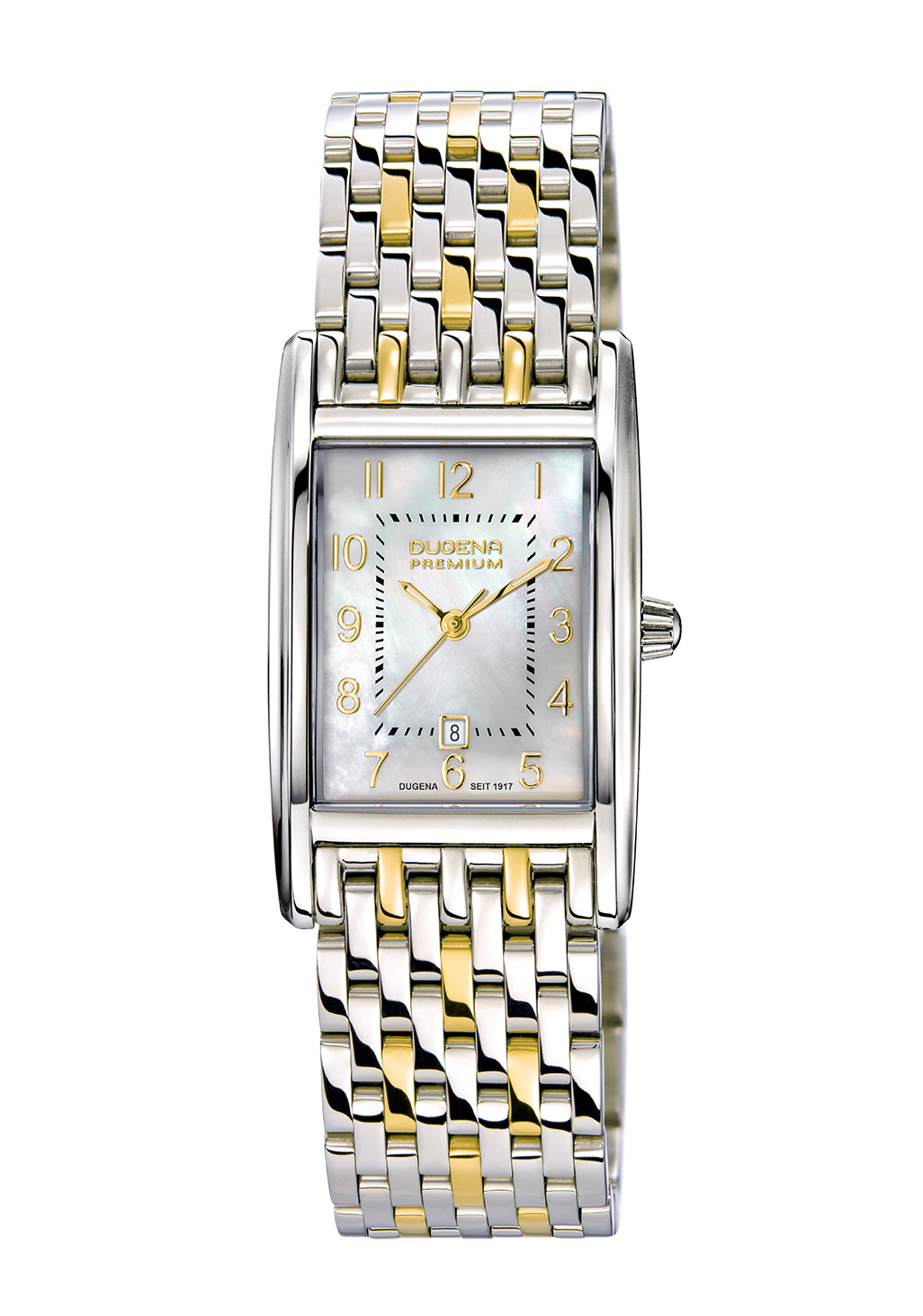 Auf dem Perlmutt-Zifferblatt befindet sich ein Dugena Logo.