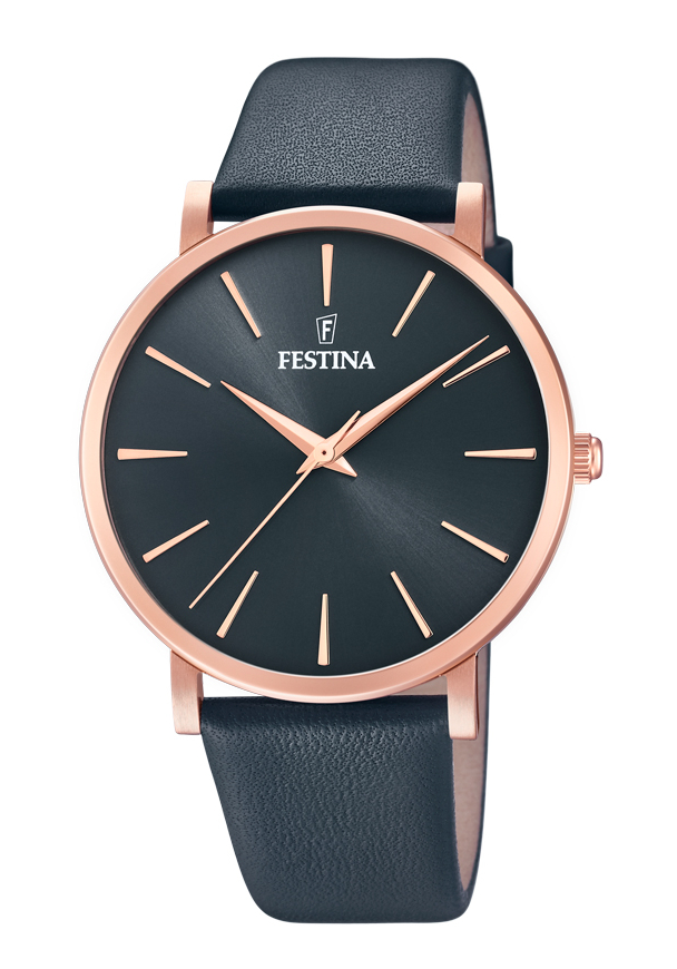 Auf dem dunkelblauen Zifferblatt befindet sich ein Festina Logo.