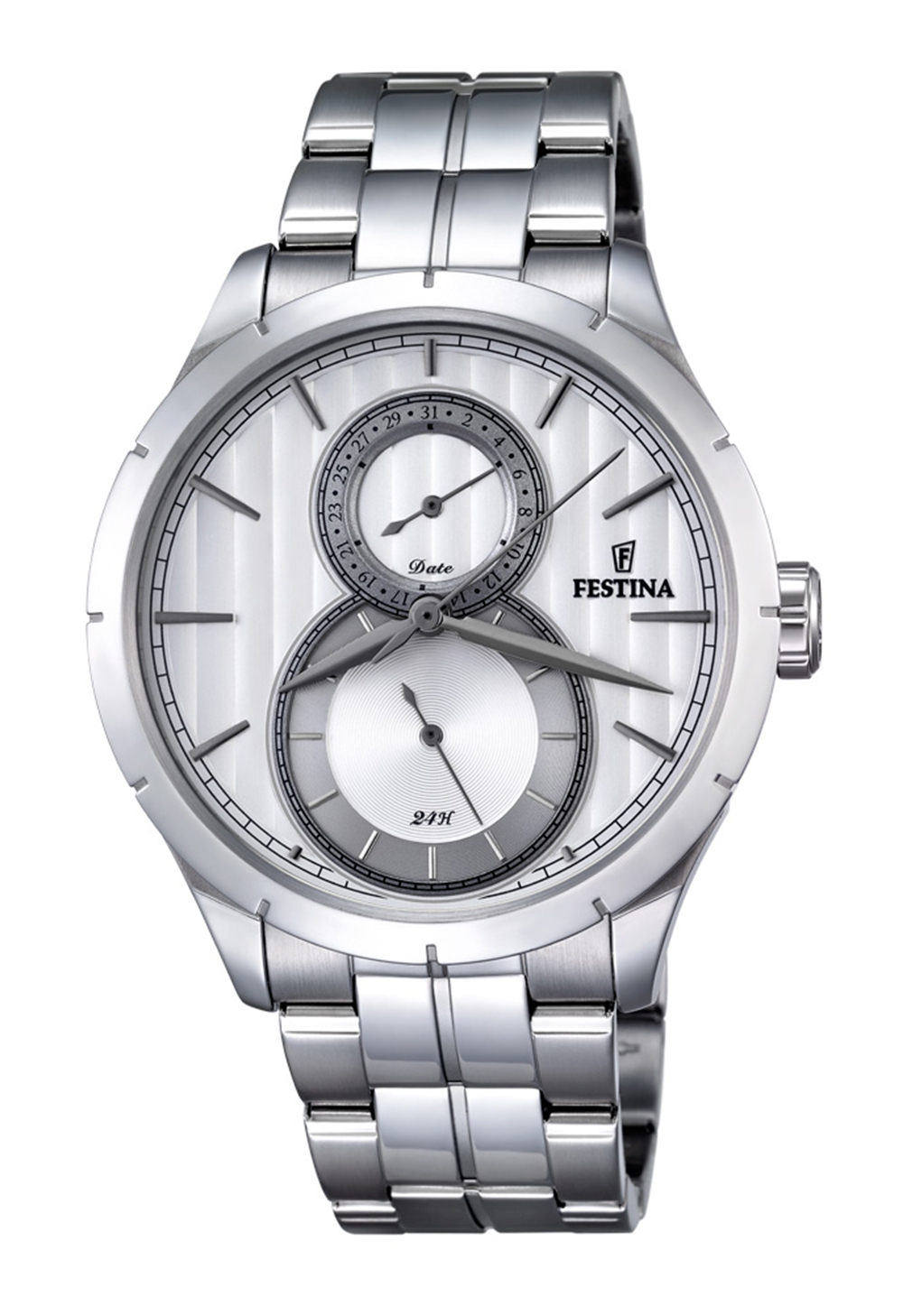 Die Uhr verfügt über eine Datums- und 24-Std. Anzeige, die sich auf dem Zifferblatt befindet.