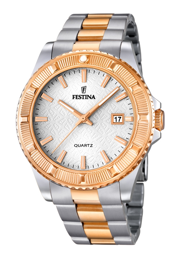 Das Zifferblatt ist strukturiert durch eingeprägte Festina Logos.