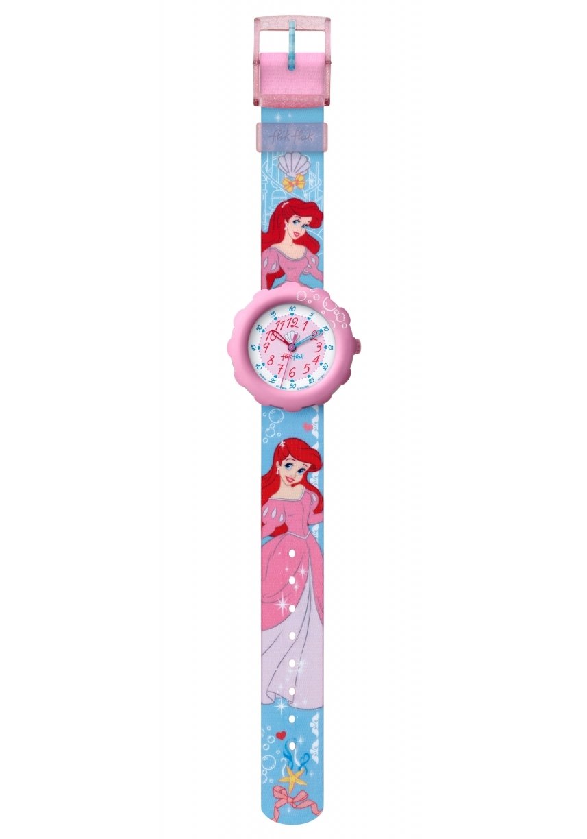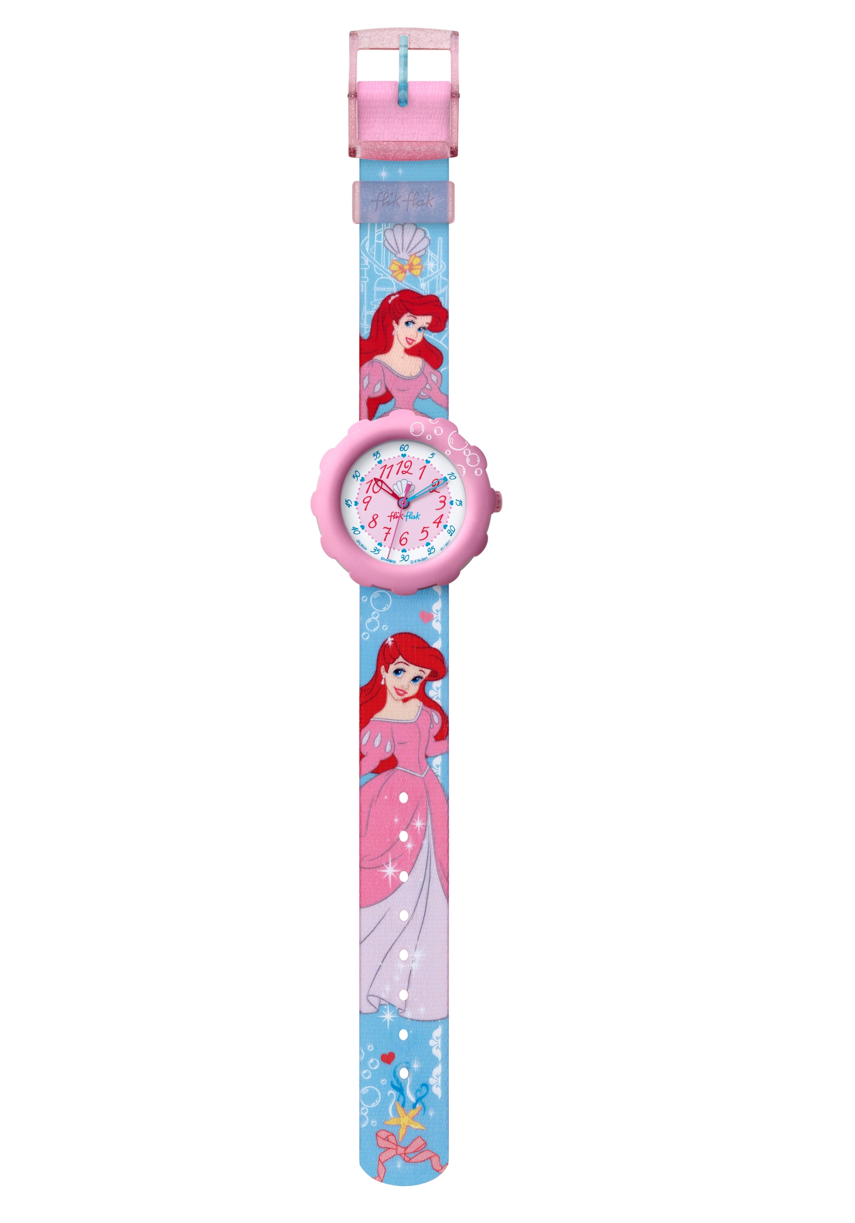 Das Armband besteht aus roséfarbenen Textil mit Ariel und Meereslebewesen bedruckt.