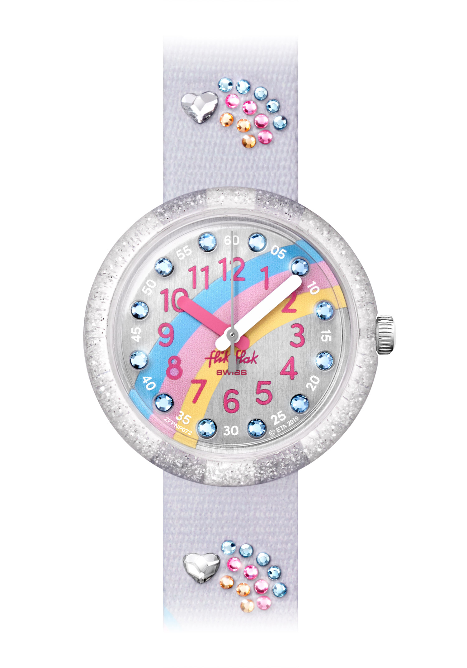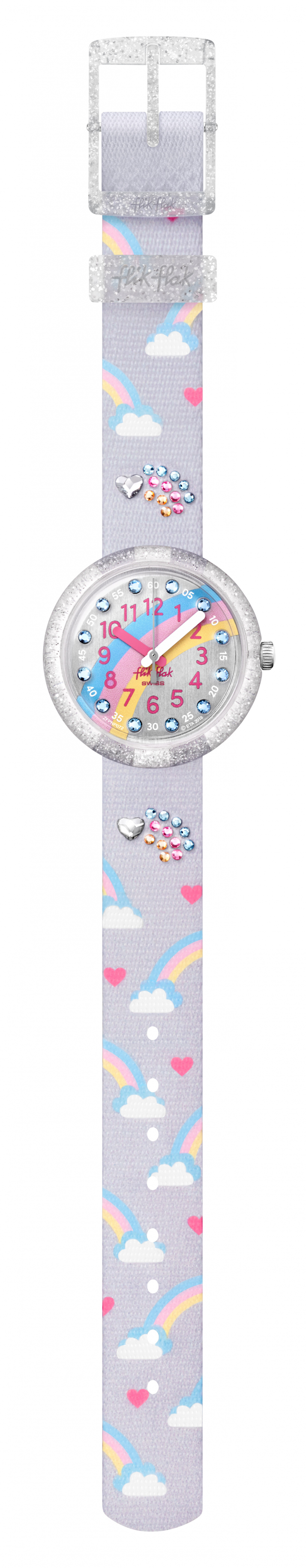 Diese bunte Kinderuhr der Marke Flik Flak wird von einem präzisen Schweizer Uhrwerk angetrieben. Das transparente Gehäuse und die Schliesse sind aus BPA-freien Bestandteilen gefertigt. Das blaue Kunststoffgehäuse hat ein Gesamtdurchmesser von 31,85 mm und eine Höhe von 9,25 mm. Ein Hauch von Glitter verleiht ihr einen himmlischen Look. Auf dem metallisch grauen Zifferblatt befindet sich ein breiter Regenbogen. Durch die großen jeweils andersfarbigen Zeiger und die deutlichen Ziffern lernen die Kleinen kinderleicht das Ablesen der Uhrzeit. Die Indizes