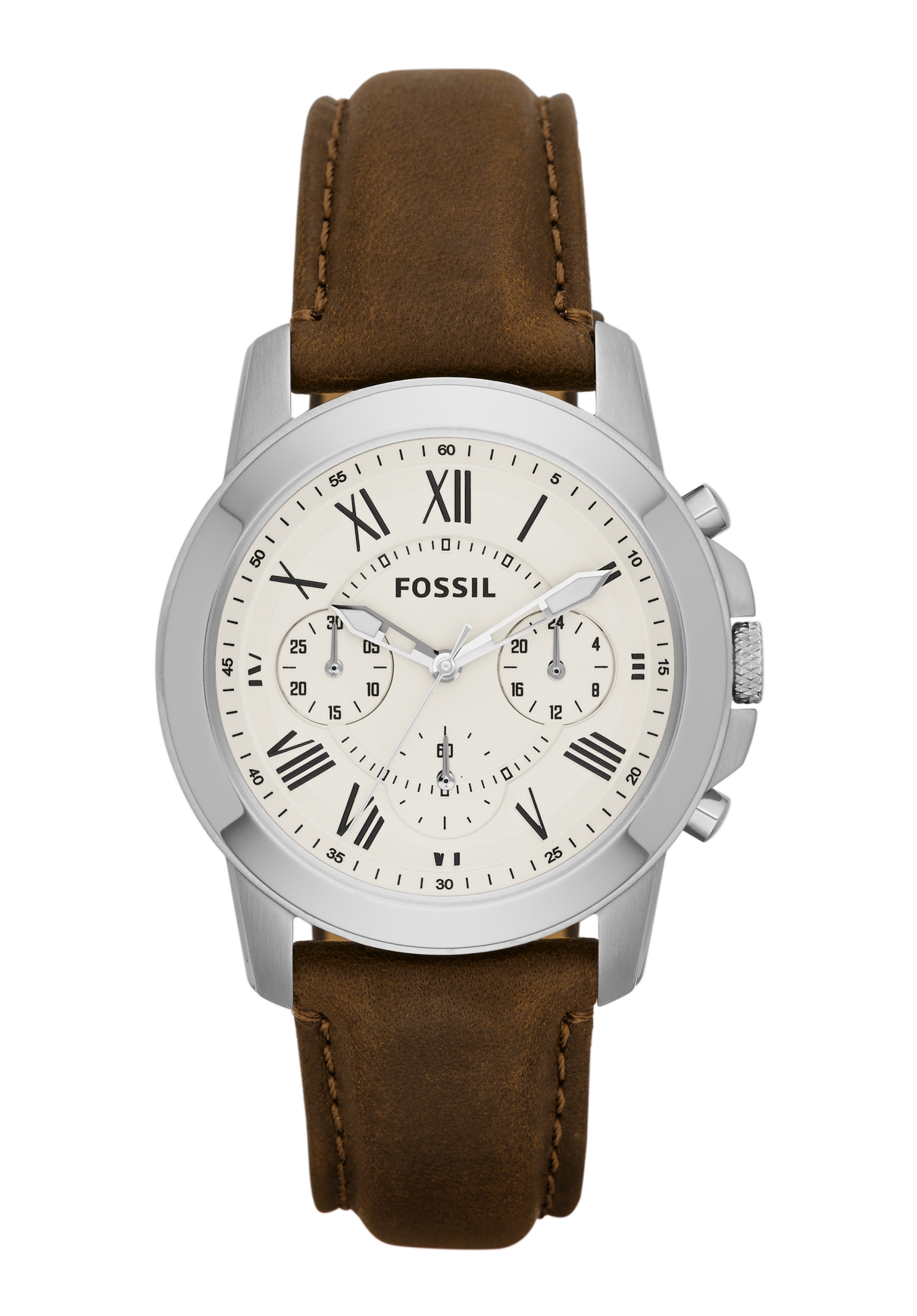 Auf dem weißen Zifferblatt befindet sich ein Fossil Logo.