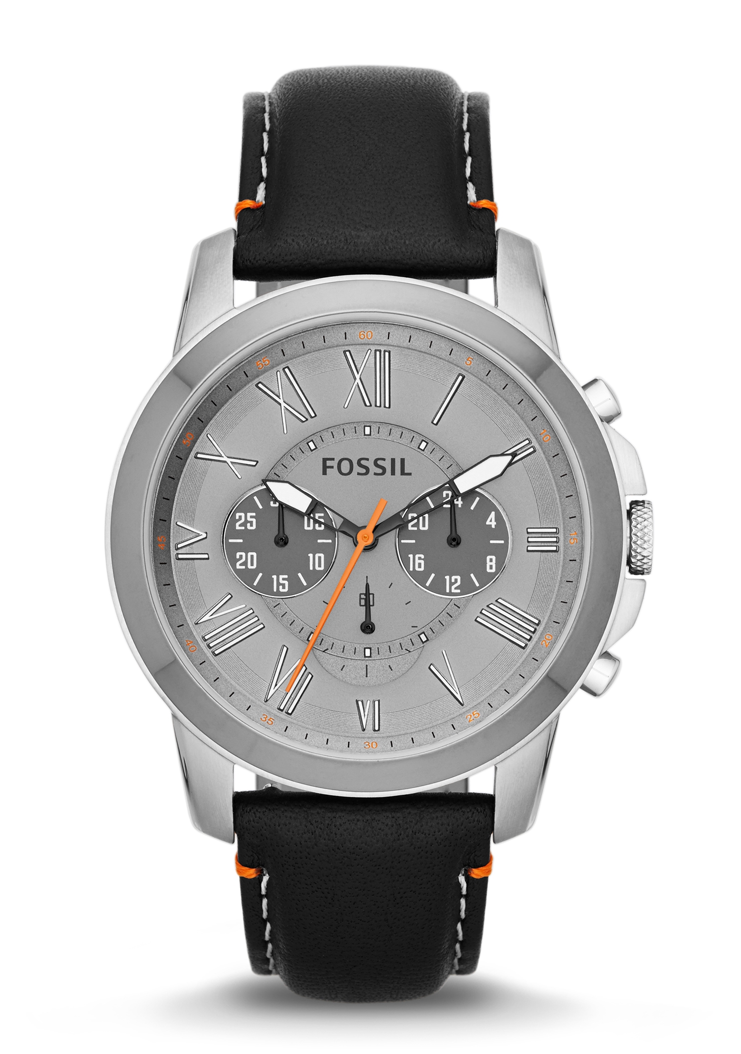 Auf dem anthrazitfarbenen Zifferblatt befindet sich ein Fossil Schriftzug.