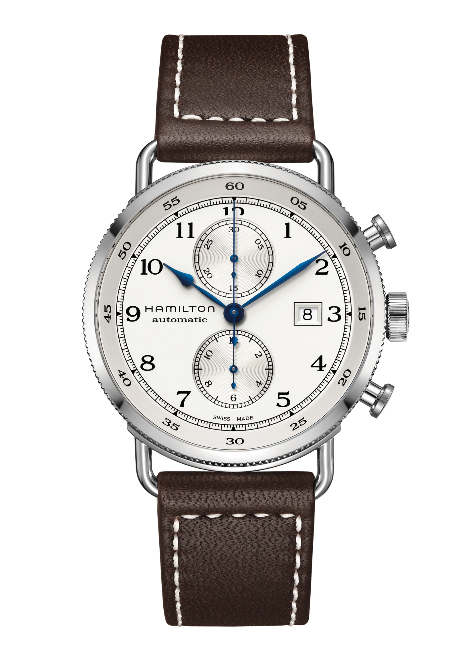 Auf dem feinen, silberfarbenen Sunray Zifferblatt befindet sich ein Hamilton Logo.
