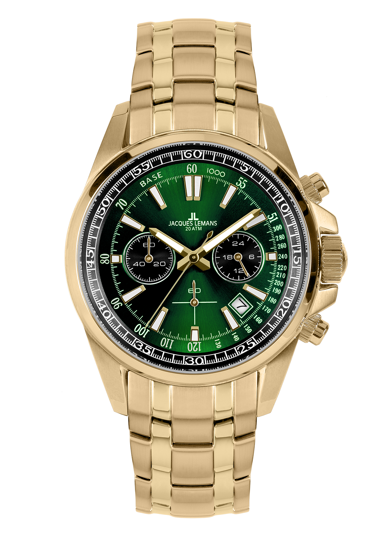 Das attraktive grüne Zifferblatt ist analog gestaltet und kommt ganz ohne Ziffern aus, was der Uhr eine besonders klare und moderne Optik verleiht. Neben der üblichen Zeitangabe verfügt der Chronograph