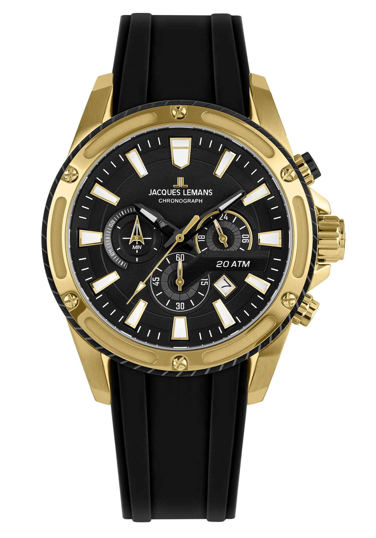 Liverpool Big-Size von Jacques Lemans ist eine markante Herrenuhr, die Stil und Funktionalität perfekt vereint. Das robuste, goldfarbene Edelstahlgehäuse mit seiner runden Form wird durch ein widerstandsfähiges Mineralglas geschützt und verleiht der Uhr eine edle, zeitlose Optik.