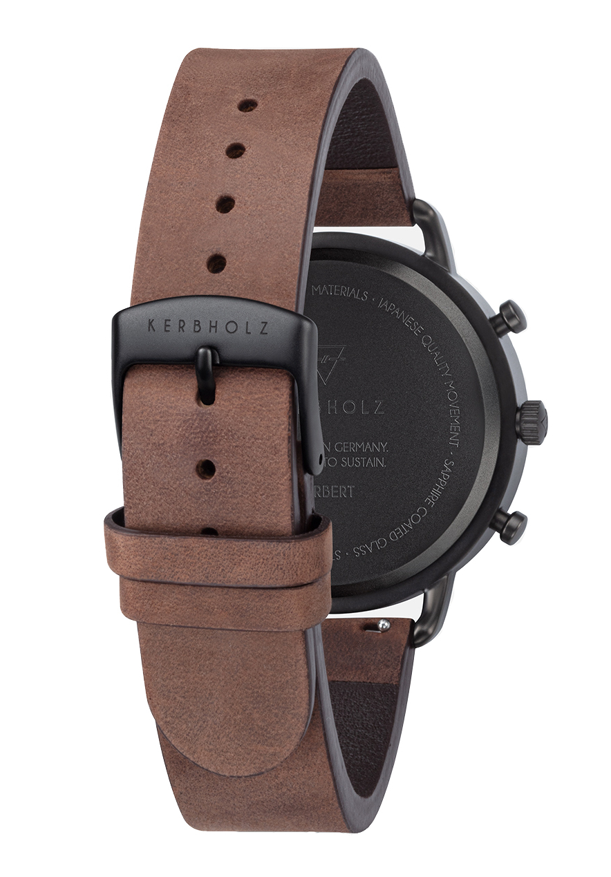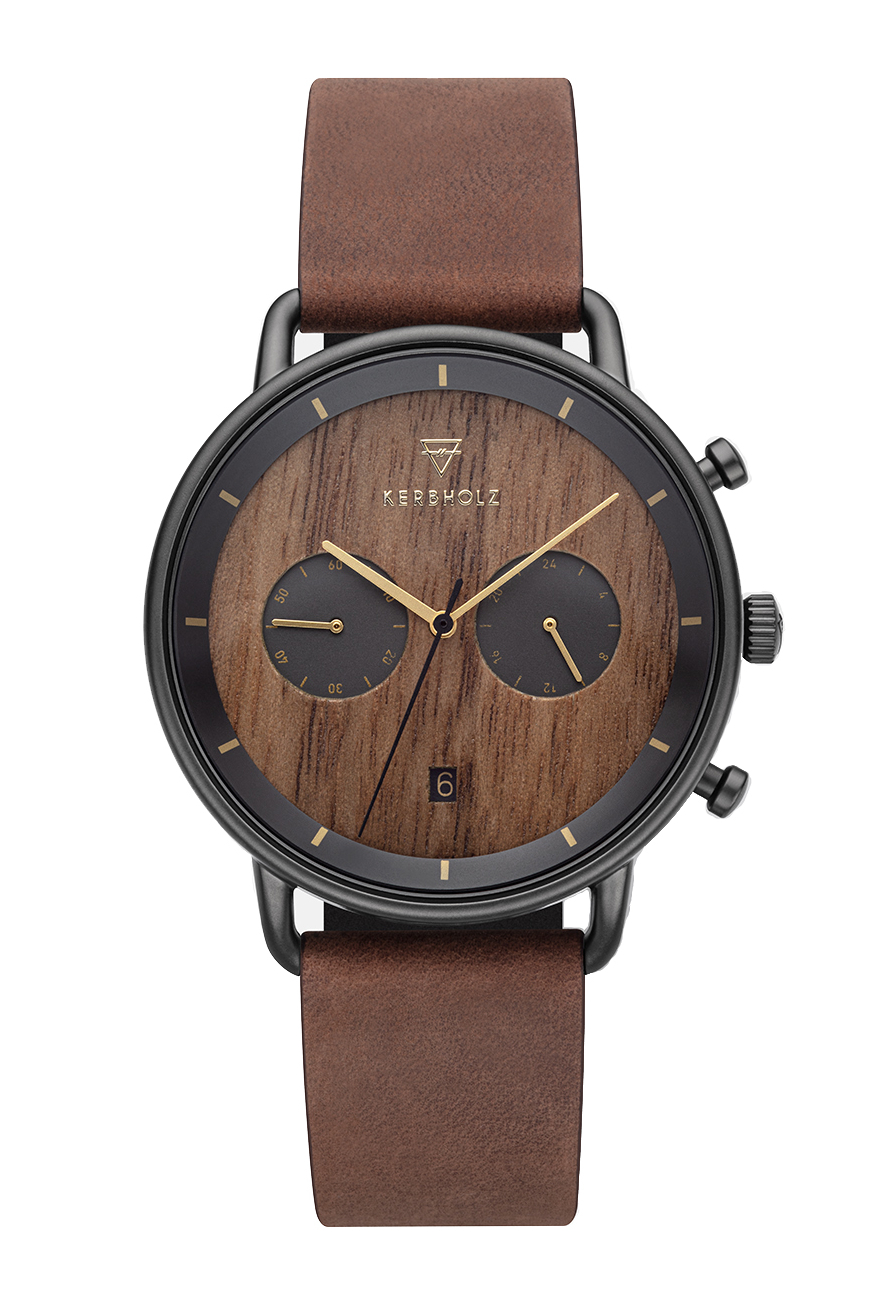 Die Herrenuhr der Marke Kerbholz ist ein wahrer Held im Alltag. Das Gehäuse ist aus hochwertigem, mattschwarz beschichteten Edelstahl hergestellt, ebenso wie der Bandanstoß. Am Rand des braunen Zifferblattes aus Naturholz mit natürlicher Maserung befinden sich Indexstriche statt Ziffern. Auf der 6-Uhr-Position ist zudem eine dezente Datumsanzeige zu finden, während die Totalisatoren als 24 Stundenanzeige und zweite Zeitzone fungieren. Als Zifferblattschutz verwendet der Hersteller ein Mineralglas, welches mit einer Saphirbeschichtung versehen ist. Angetrieben wird diese Multifunktionsuhr durch ein präzises Hattory Quarzwerk. Der Durchmesser beträgt etwa 42 mm, wohingegen die Höhe bei ca. 10 mm liegt. Das hochwertige tabakbraune Lederarmband mit Easy-Click-Verschluss wird mit einer zuverlässigen schwarz beschichteten Dornschließe