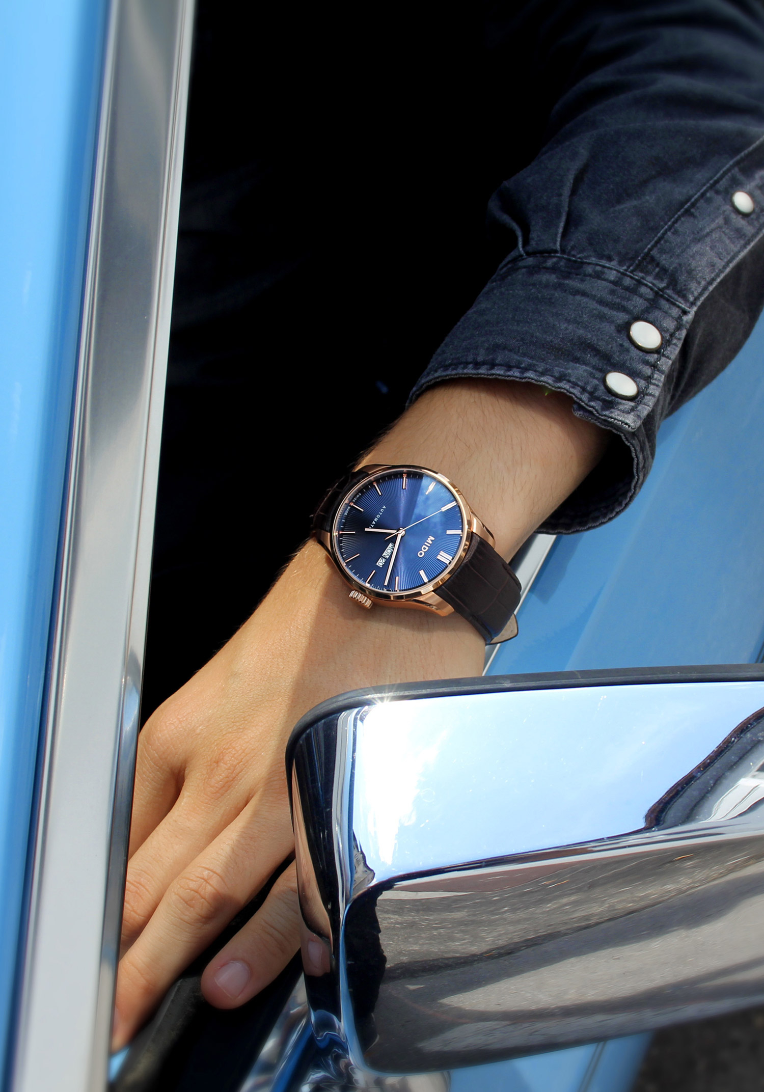 Auf dem strukturierten, dunkelblauen Zifferblatt finden sich erhabene Indizes
