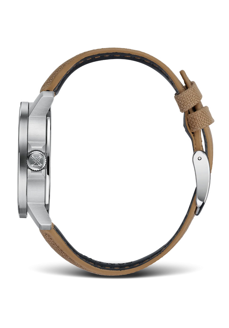 Die Uhr wird an einem sandfarbenen Canvasband (18 mm) mit Dornschließe