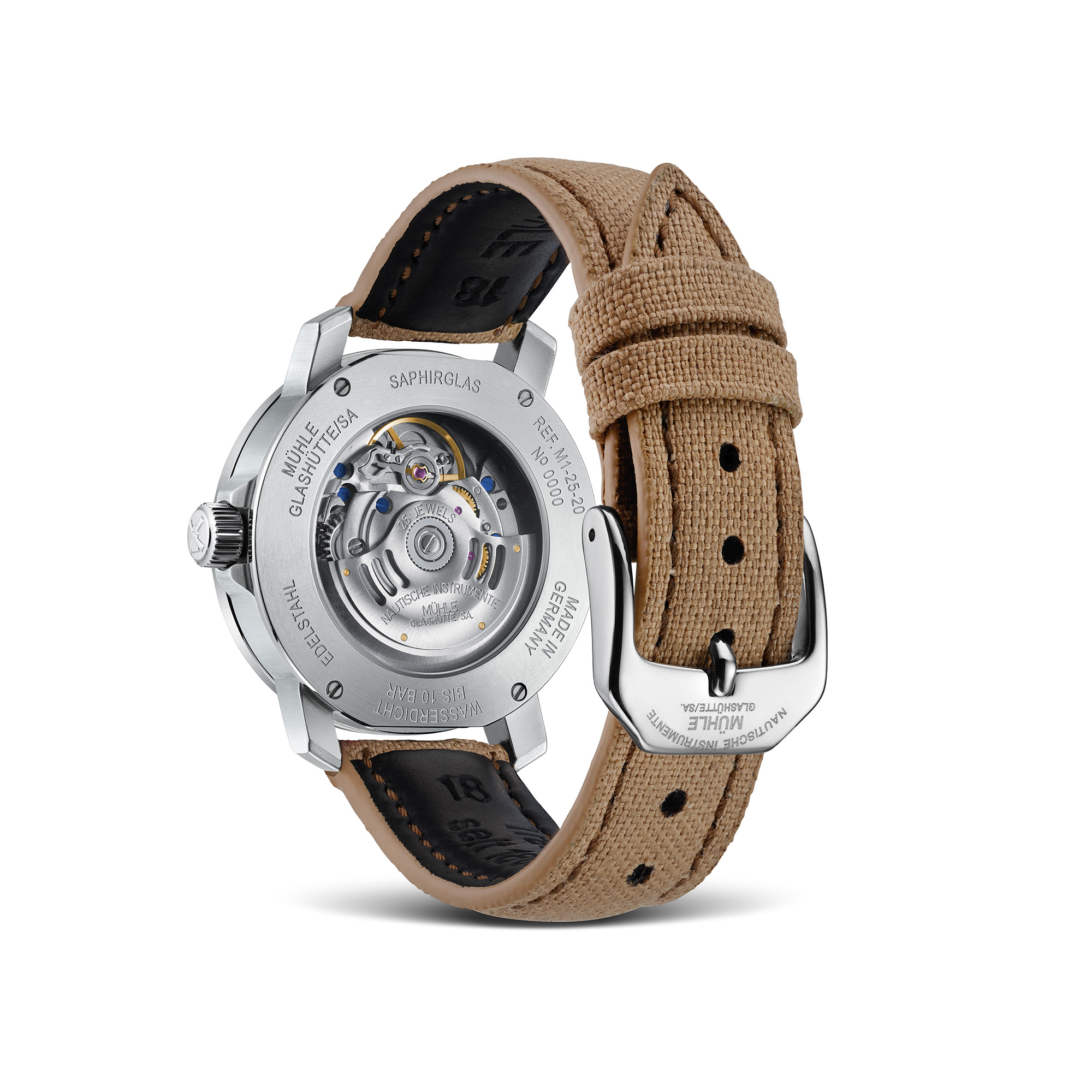 Über einen Glasboden lässt sich das in der Uhr verbaute Automatikkaliber SW 200-1 (Version Mühle) betrachten. Das Werk verfügt über Spechthalsregulierung, Sekundenstopp, eine Datumschnellkorrektur sowie eine Gangreserve