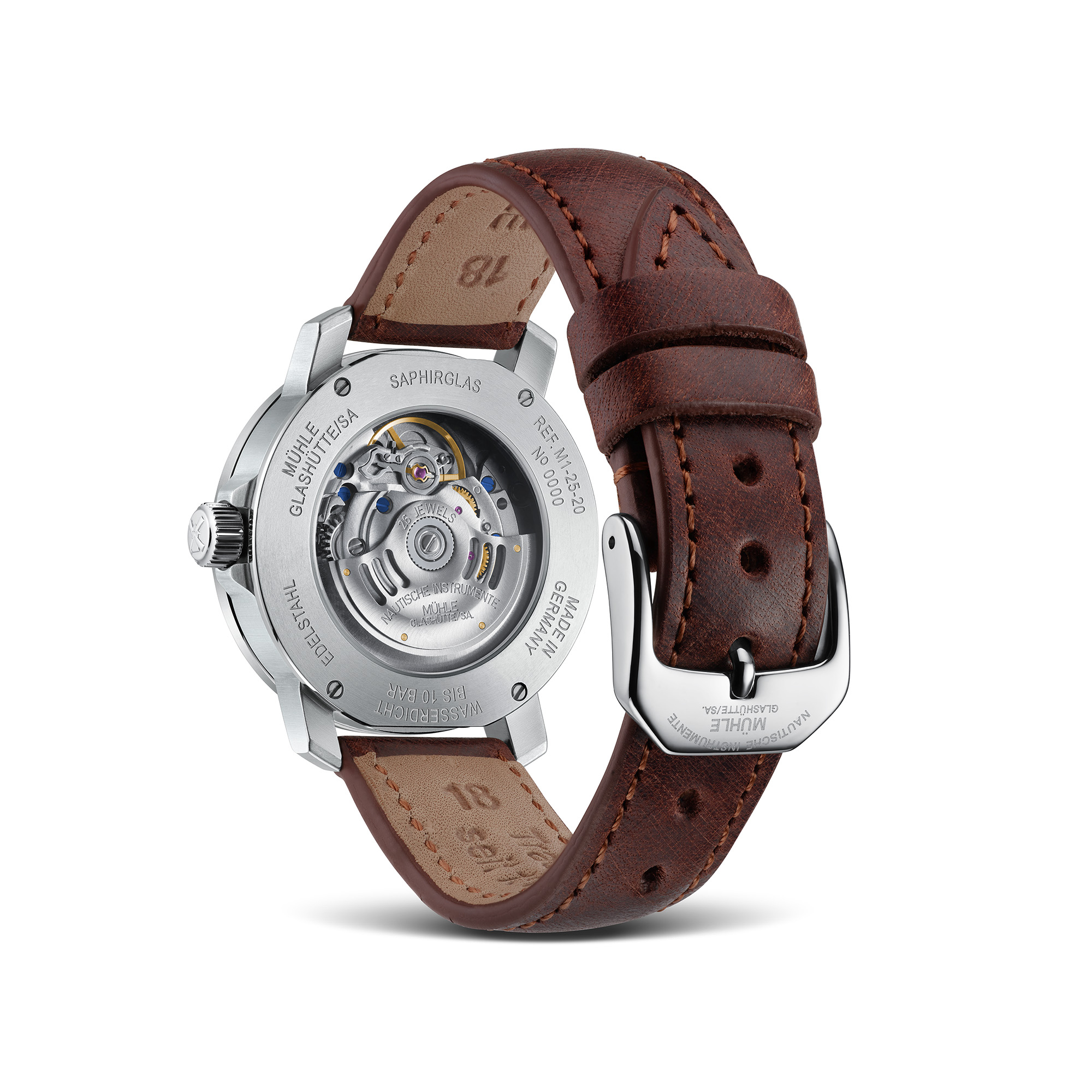 Über einen Glasboden lässt sich das in der Uhr verbaute Automatikkaliber SW 200-1 (Version Mühle) betrachten. Das Werk verfügt über Spechthalsregulierung, Sekundenstopp, eine Datumschnellkorrektur sowie eine Gangreserve