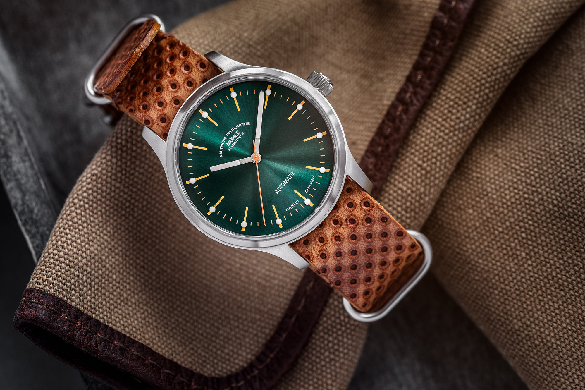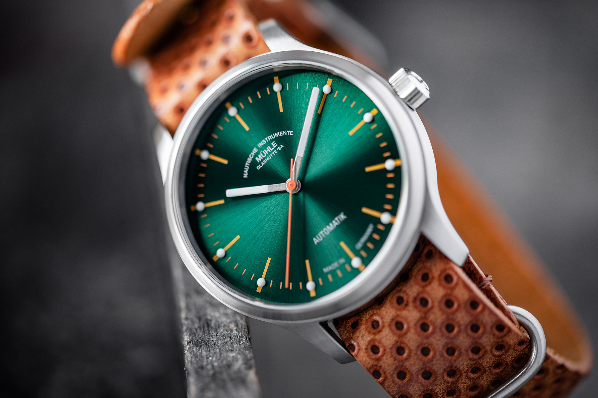 verbirgt sich ein strahlend grünes Zifferblatt mit Sonnenschliff. Das Zifferblatt wirkt so je nach Lichteinfall heller oder dunkler.