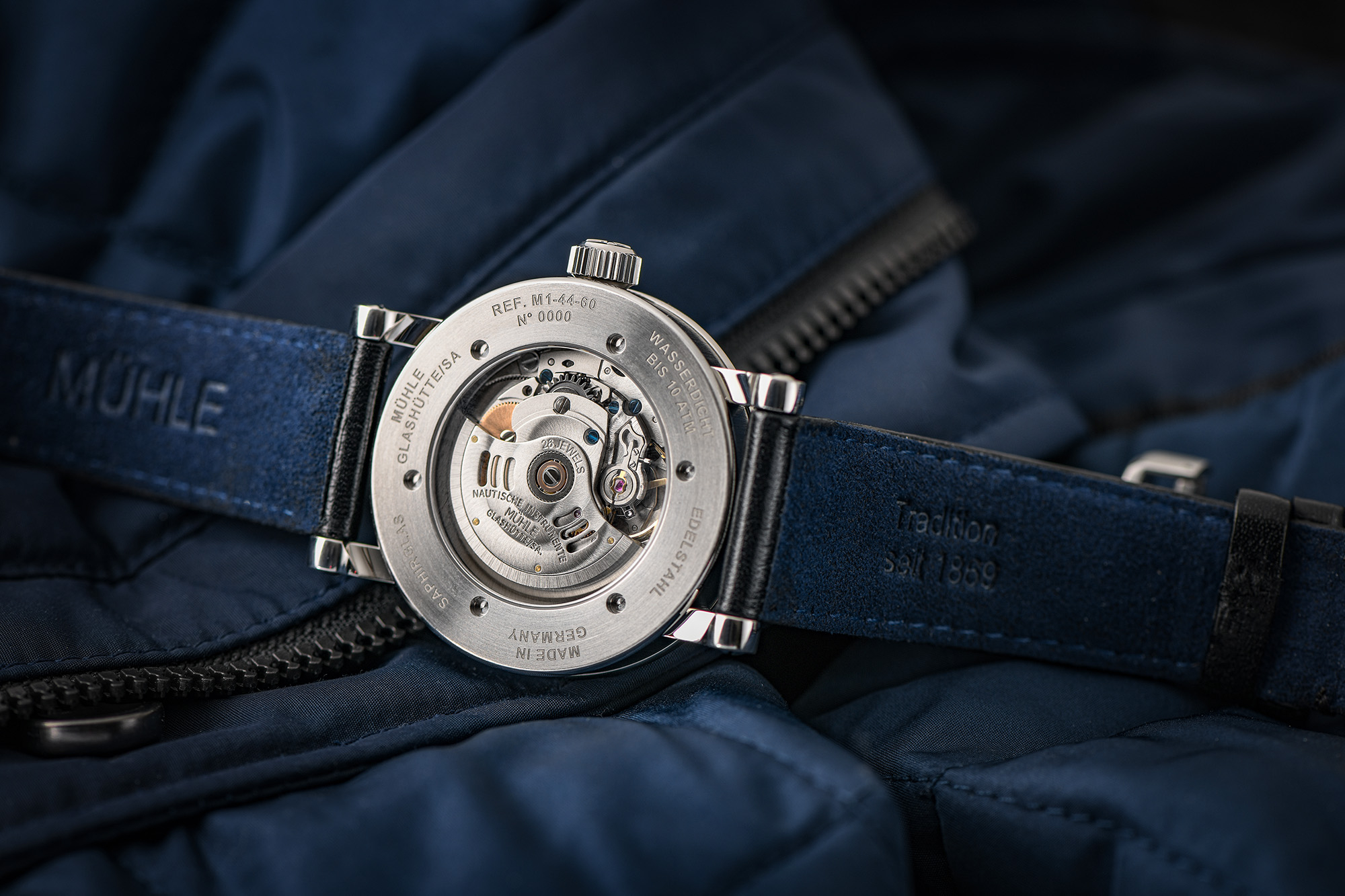 Über einen Glasboden lässt sich das bewährte Automatikwerk SW288-1 (Version Mühle) betrachten. Das Werk verfügt über Spechthalsregulierung und Sekundenstopp sowie einer Gangreserve