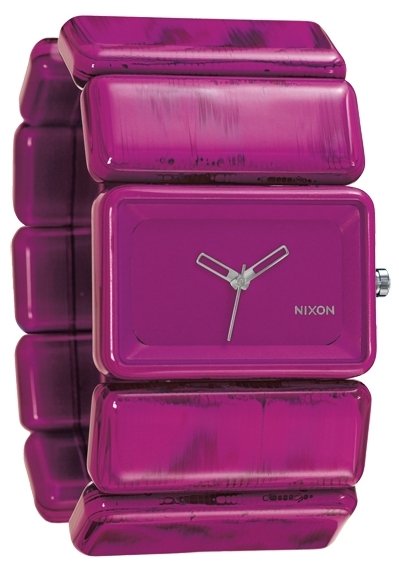 Das pinke Zifferblatt ist verziert mit dem Nixon Schriftzug