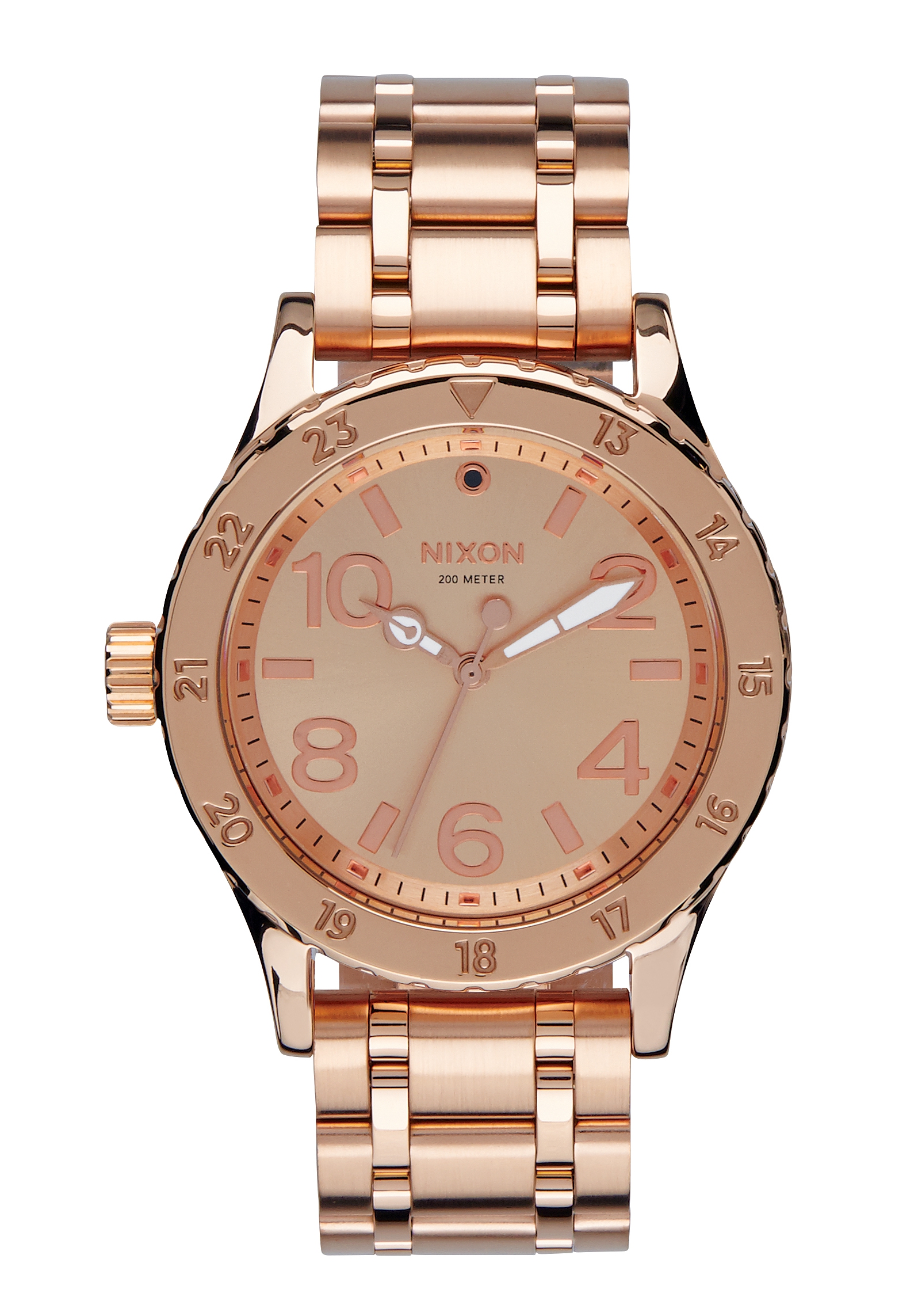 Auf dem rosé-goldfarbenen Sunray Zifferblatt befindet sich das Nixon Logo.