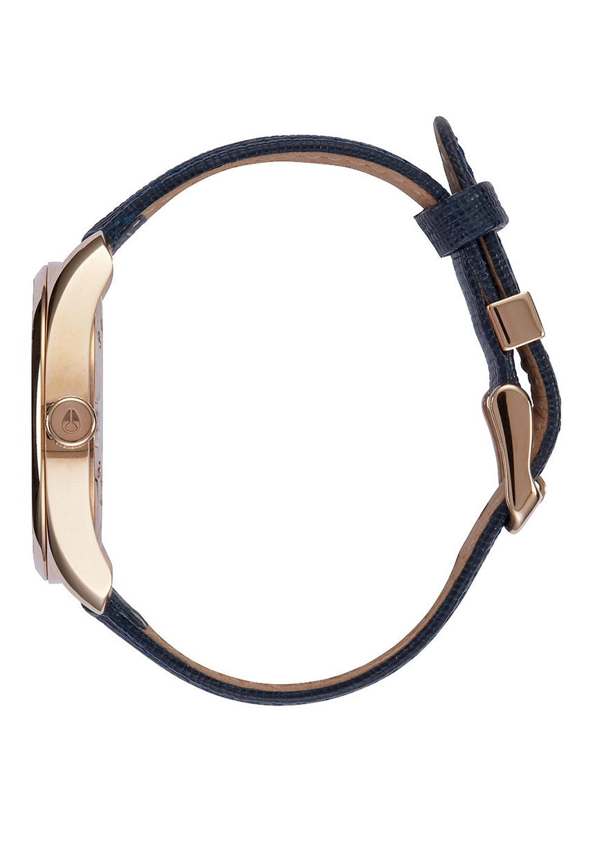 Das Band ist aus hochwertigem, dunkelblauen Leder gefertigt und mit einer Eidechsen-Prägung versehen.