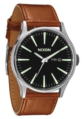 Auf dem schwarzen Zifferblatt befindet sich ein Nixon Logo.