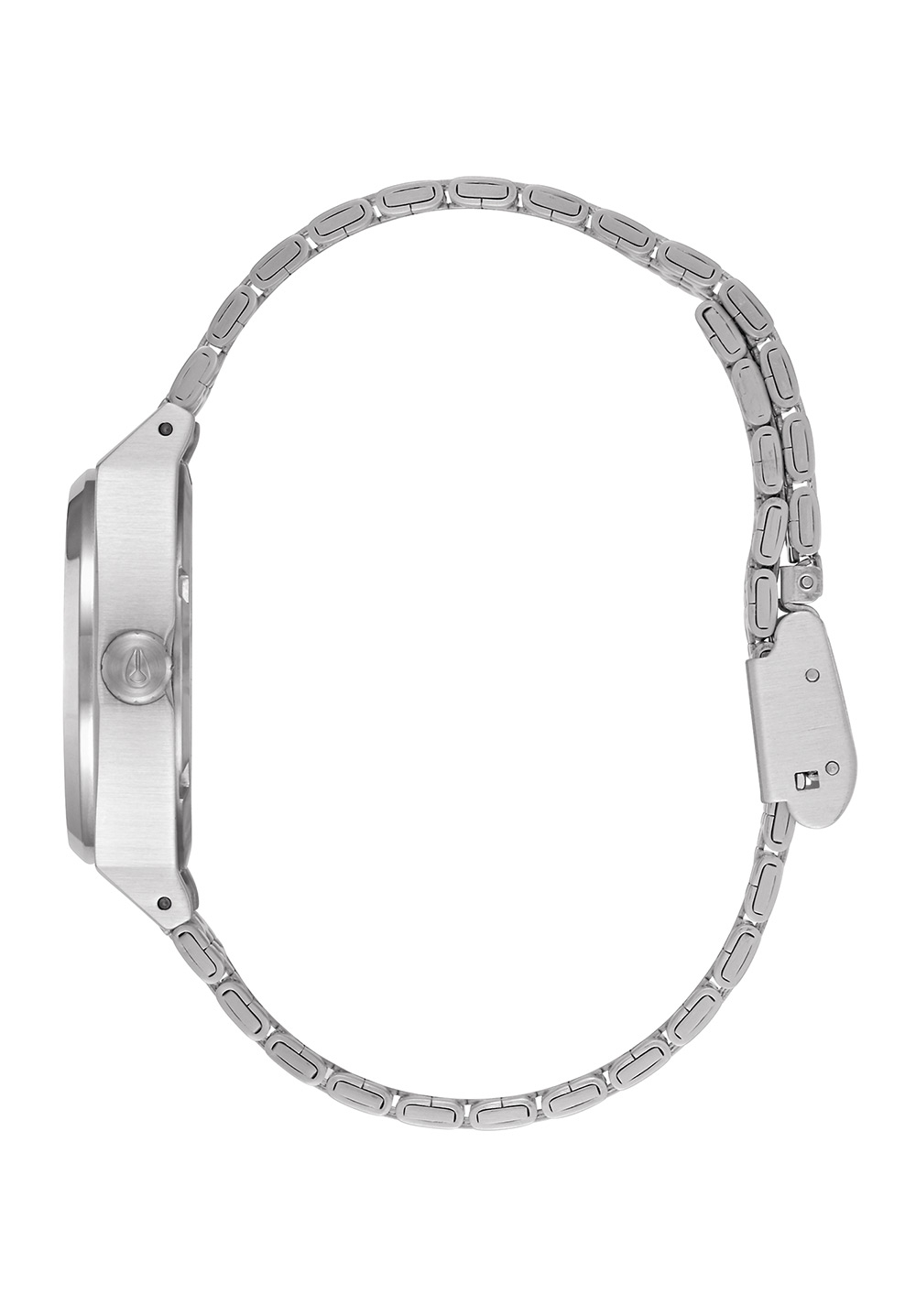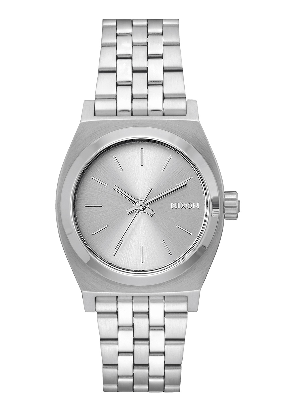 Auf dem silberfarbenen Zifferblatt befindet sich ein Nixon Logo.
