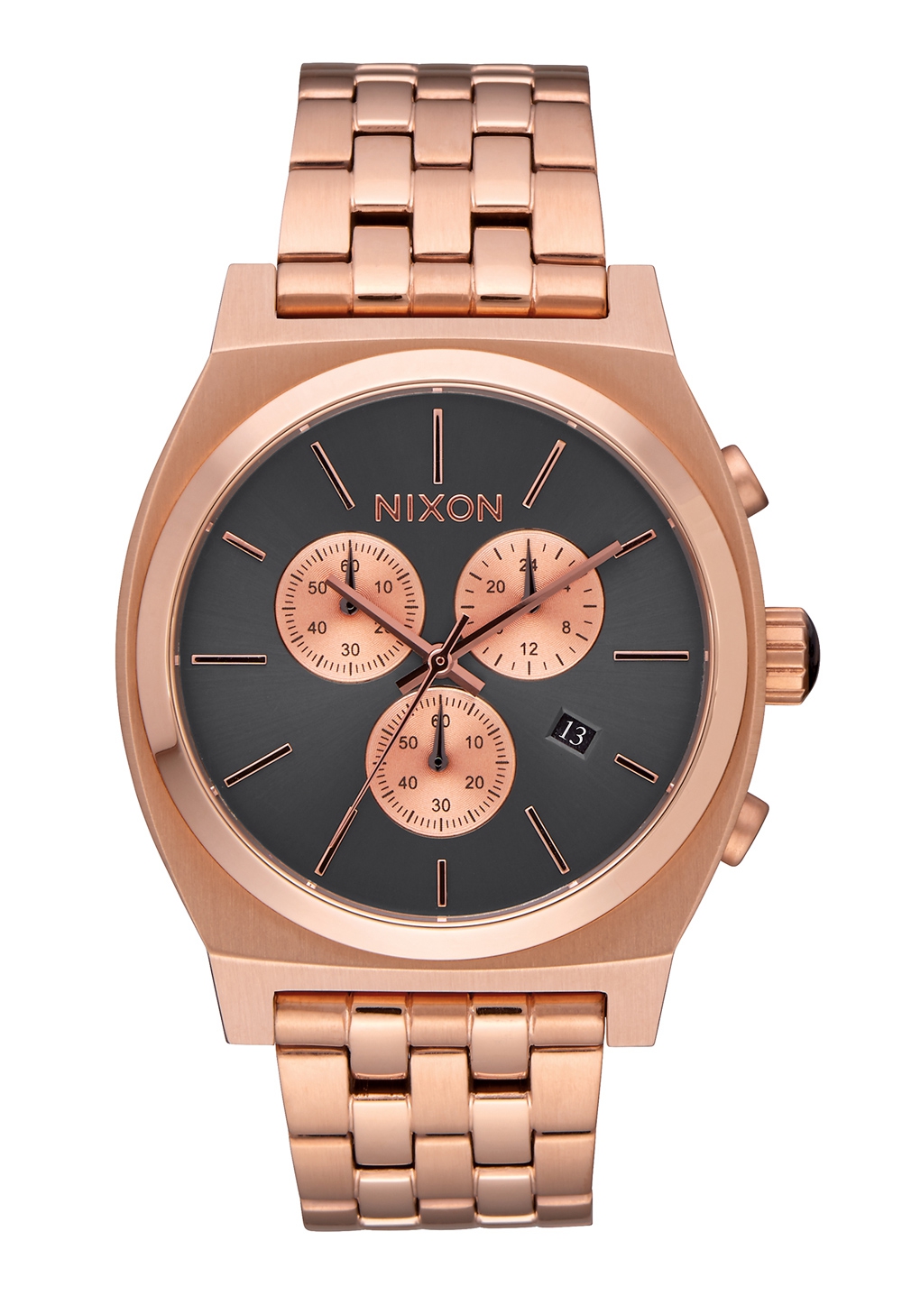 Auf dem anthrazitfarbenen Zifferblatt befindet sich ein Nixon Logo.