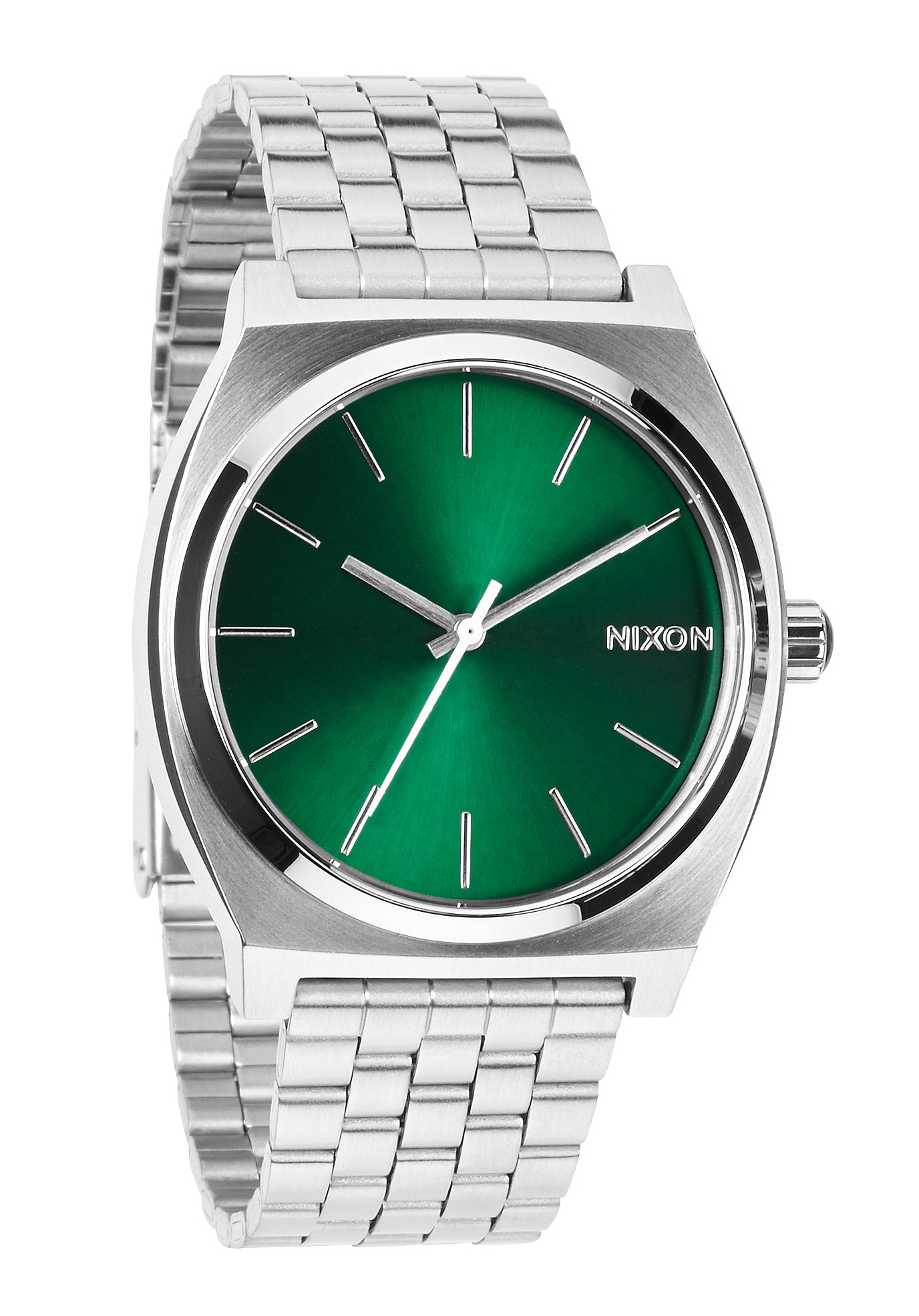Auf dem grünen Sunray Zifferblatt befindet sich der Schriftzug der Marke Nixon.