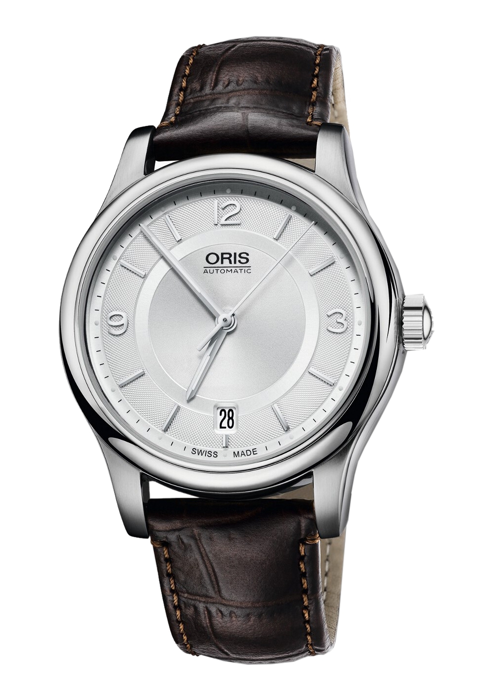 Auf dem silber, guillochierten Zifferblatt befindet sich ein Oris Logo.