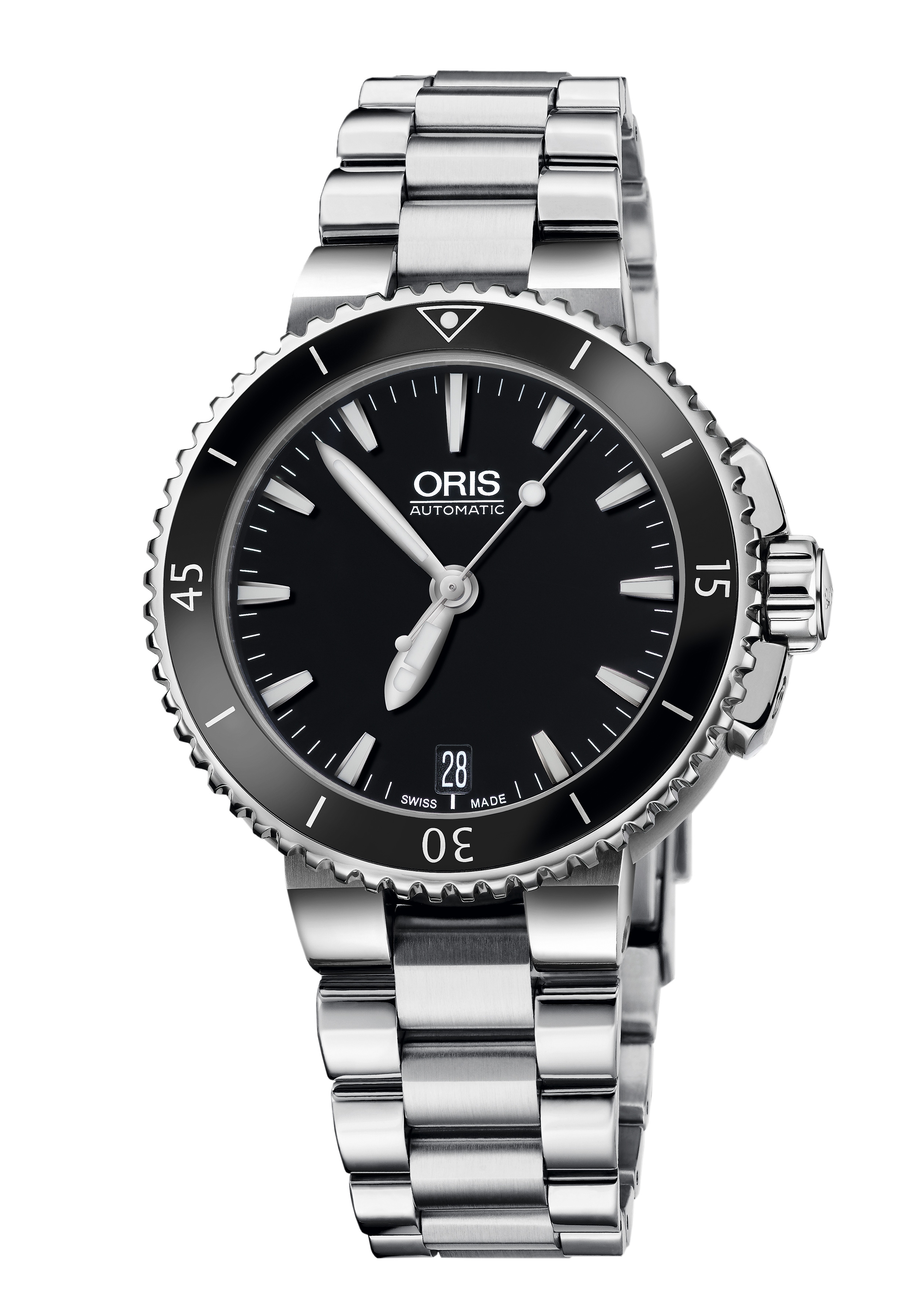 Auf dem schwarzen Zifferblatt befindet sich Oris Logo.