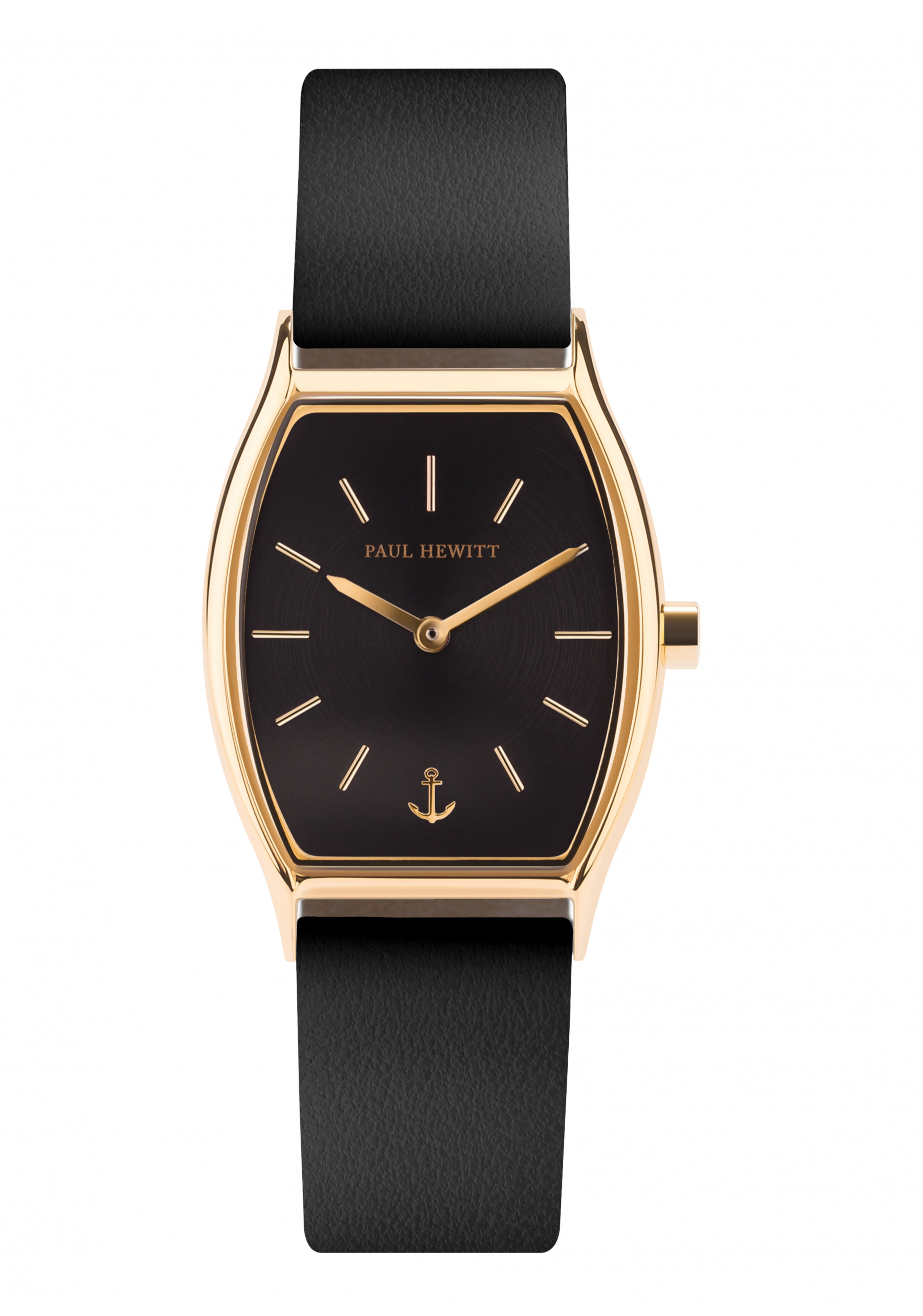 Auf dem schwarzen, puristischen Zifferblatt befindet sich ein Paul Hewitt Schriftzug.