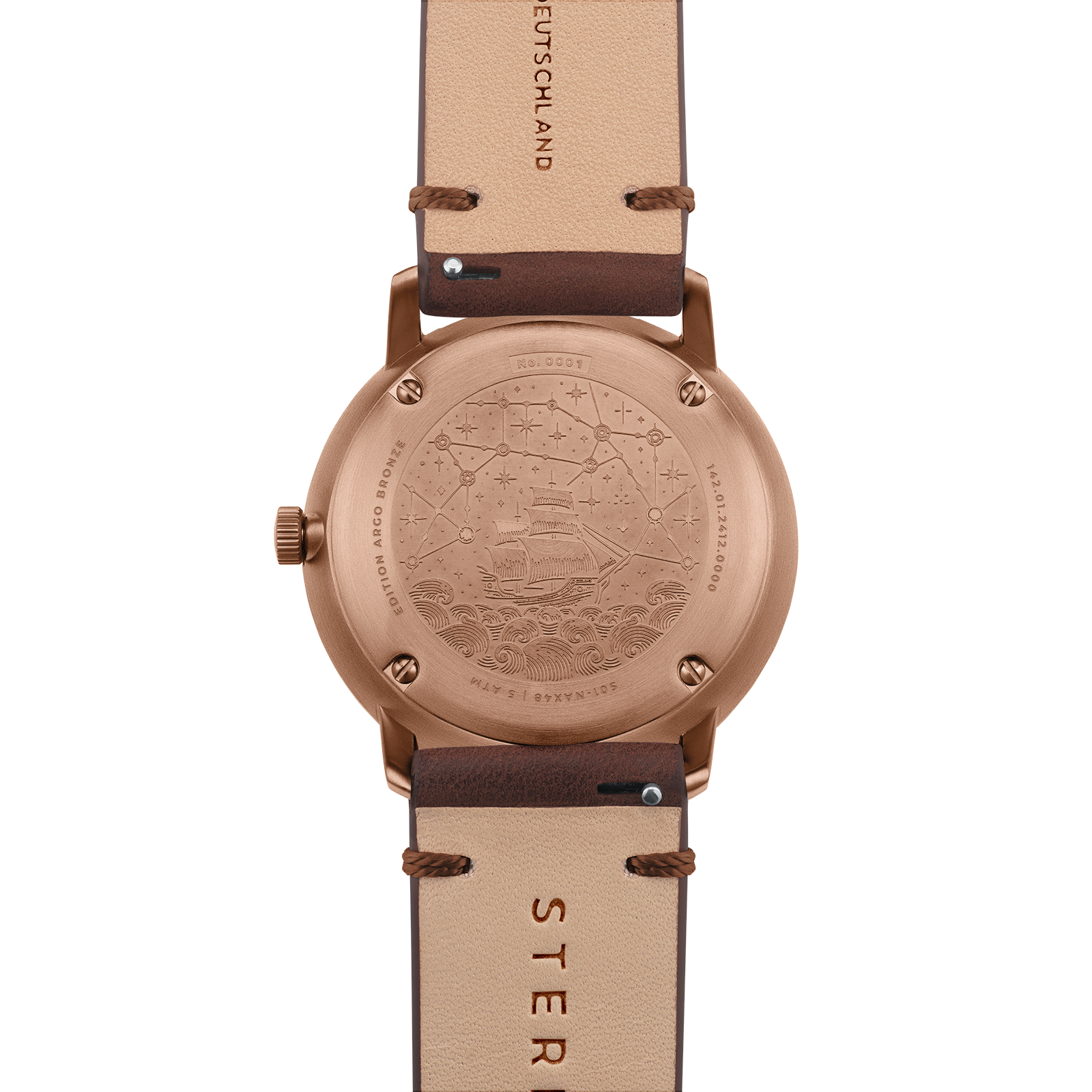 schützt das Innenleben der Uhr vor äußeren Einflüssen. Das mokkabraune Lederarmband im Vintagelook wird mit einer bronzefarbenen Dornschliesse sicher verschlossen. Auf der Gehäuserückseite befindet sich eine der Editionsgravur des Sternbildes Argo, es beschreibt das legendäre Schiff der Argonauten, welche sich angeführt durch Jason auf der Suche nach dem goldenen Vlies befanden. Dank dem integrierten Schnellwechselsystem lassen sich die Sternglas Armbänder in wenigen Handgriffen ohne Werkzeug nach Lust und Laune austauschen