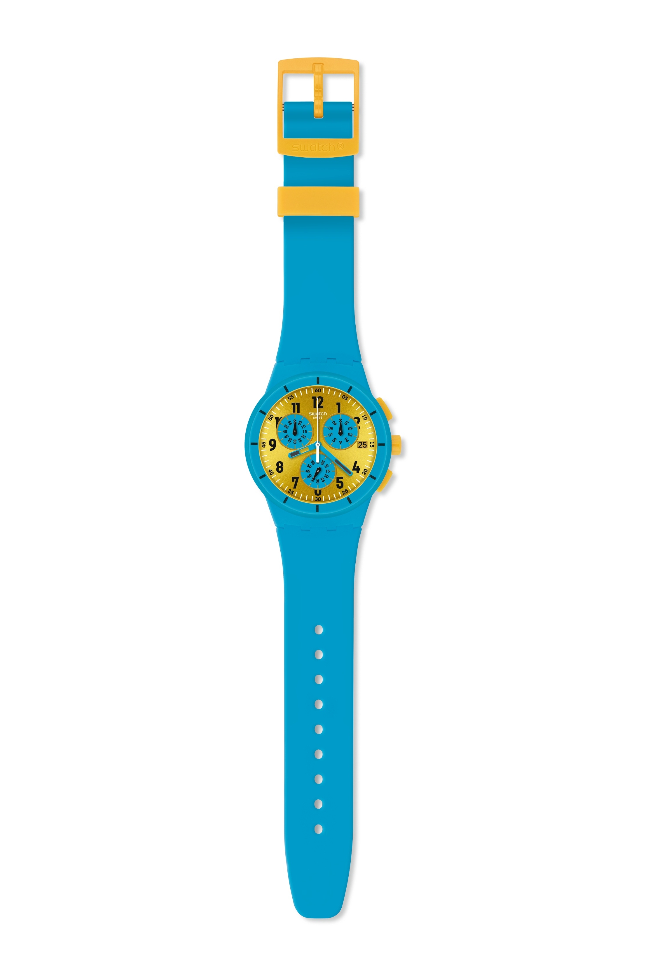 Das Zifferblatt ist gelb-goldfarben mit blau-türkisfarbenen Zeigern und schwarzen Indizes