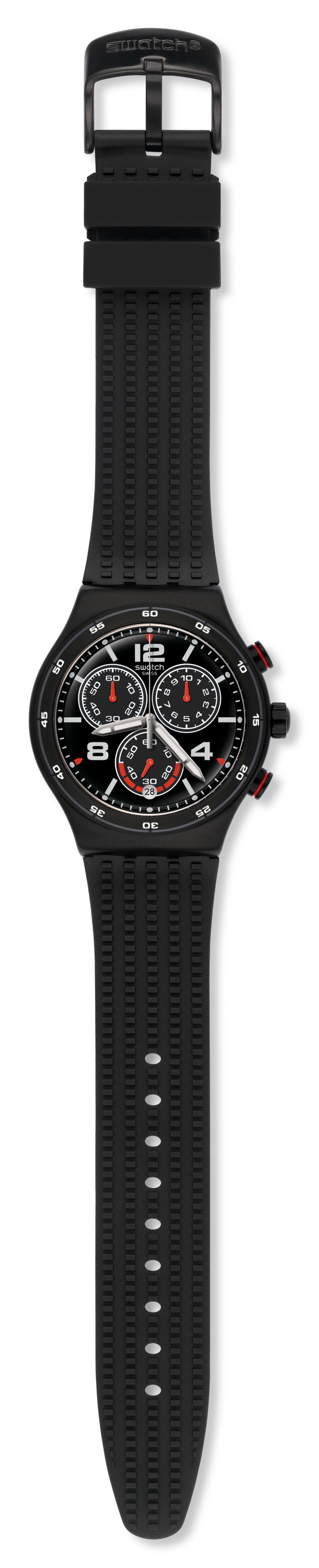 Auf dem schwarzen Zifferblatt befindet sich ein Swatch Logo.