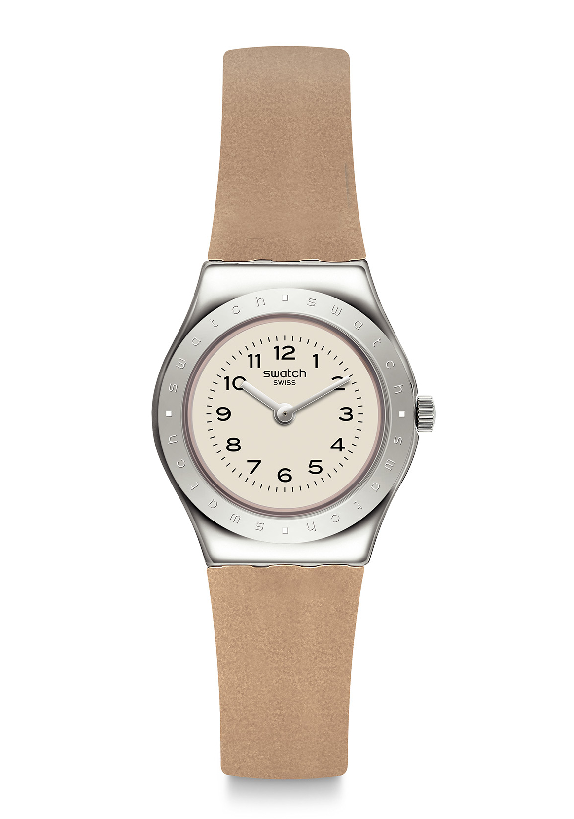 Das beige Zifferblatt trägt das Swatch Logo auf der Zwölf und eine vollständige Minuterie in Schwarz.