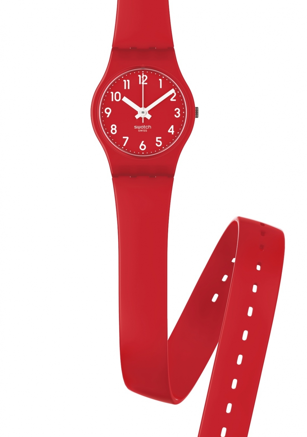 Das Zifferblatt ist rot mit weißen Zeigern und Indizes