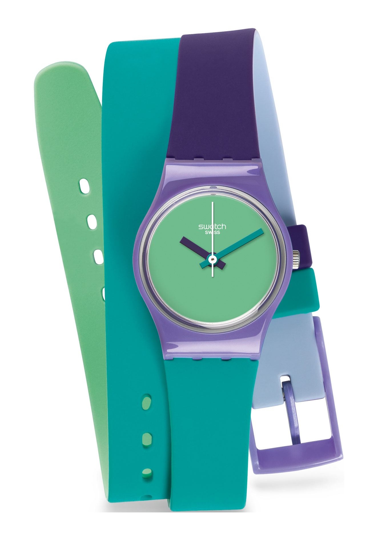 Auf dem grünen Zifferblatt befindet sich das Swatch Logo in Weiß unter der 12-Uhr Position.