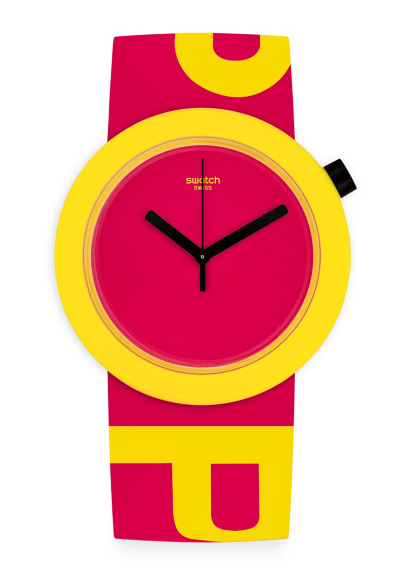 Auf dem roten Zifferblatt befindet sich ein Swatch Logo.