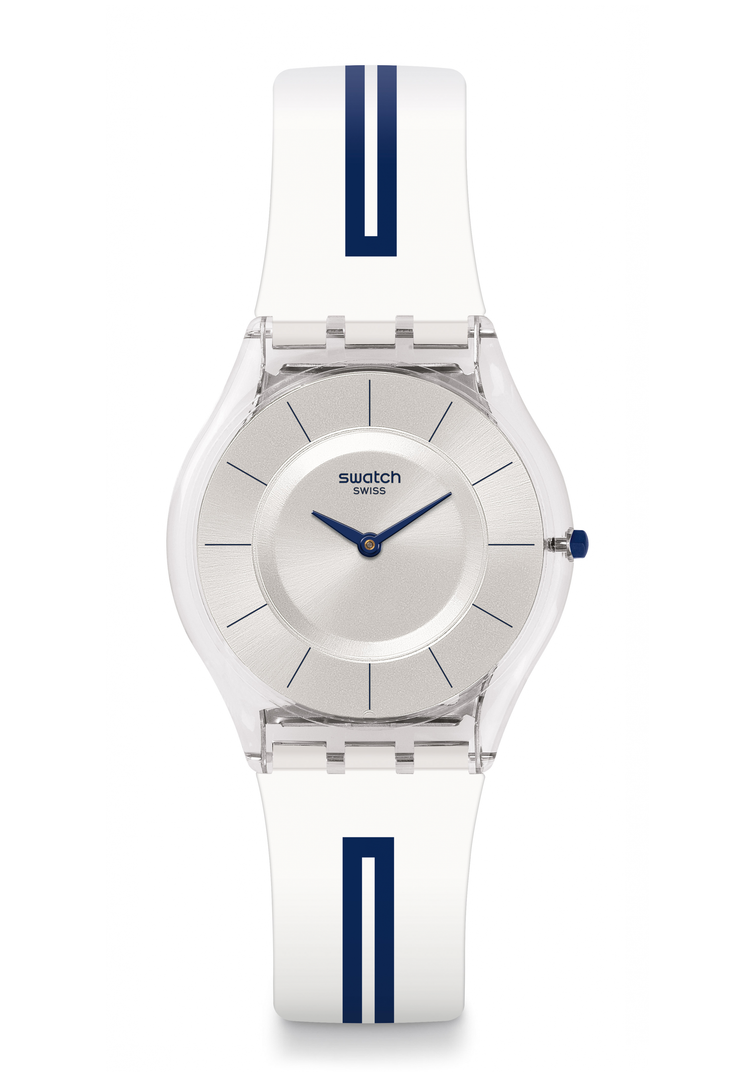 Ein weißes Silikonarmband mit blauen Streifen gewährt einen angenehmen Tragekomfort.