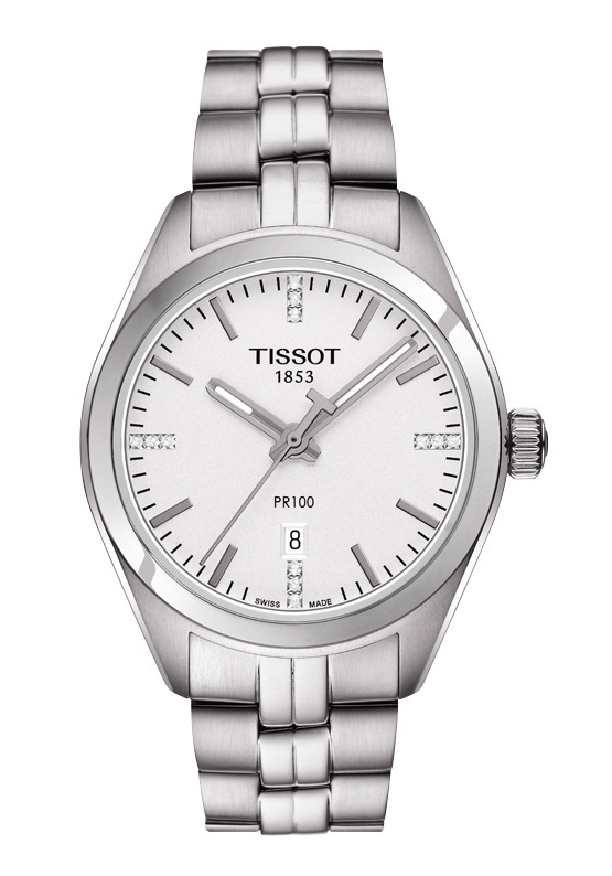Auf dem silberfarbenen Zifferblatt befindet sich ein Tissot Logo.