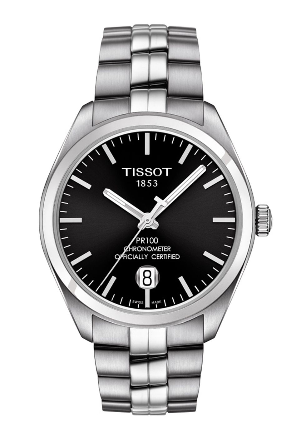 Auf dem schwarzen Zifferblatt befindet sich ein Tissot Logo.