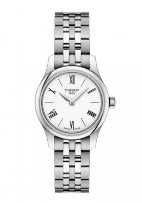 Auf dem weißen Zifferblatt befindet sich ein Tissot Logo.