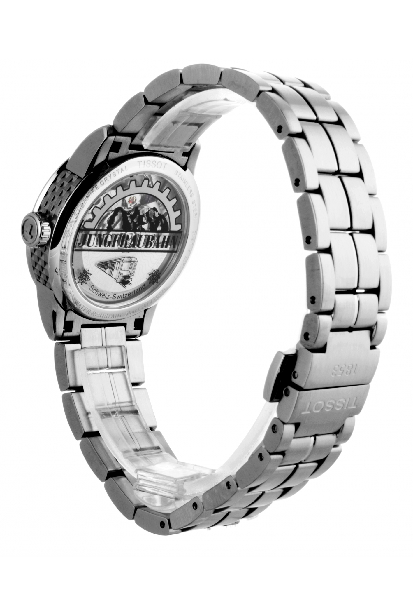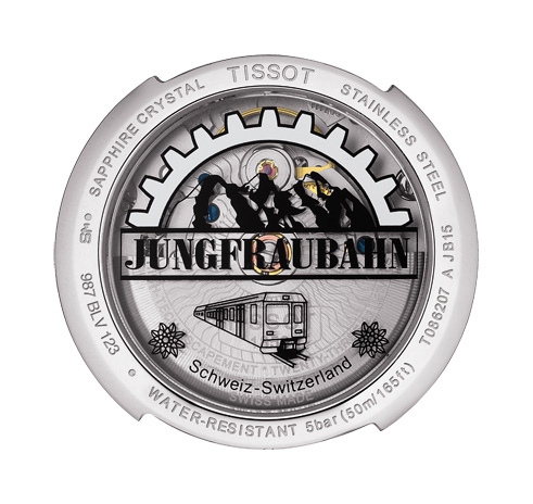 Das Jungfraubahn-Logo ist auf dem Sichtboden gedruckt, durch den der Träger auch das wunderschöne Powermatic 80 Uhrwerk beobachten kann.