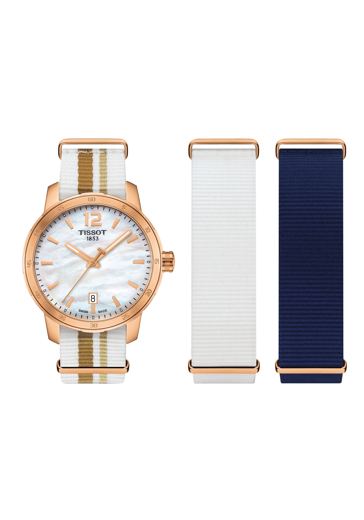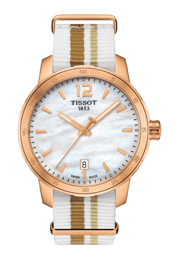Auf dem Perlmutt-Zifferblatt befindet sich ein Tissot Logo.