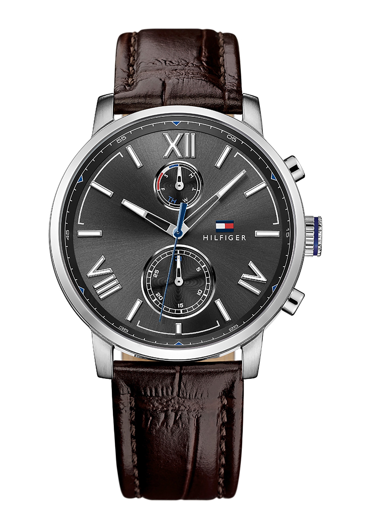 Auf dem anthrazitfarbenen Zifferblatt befindet sich ein Tommy Hilfiger Logo.